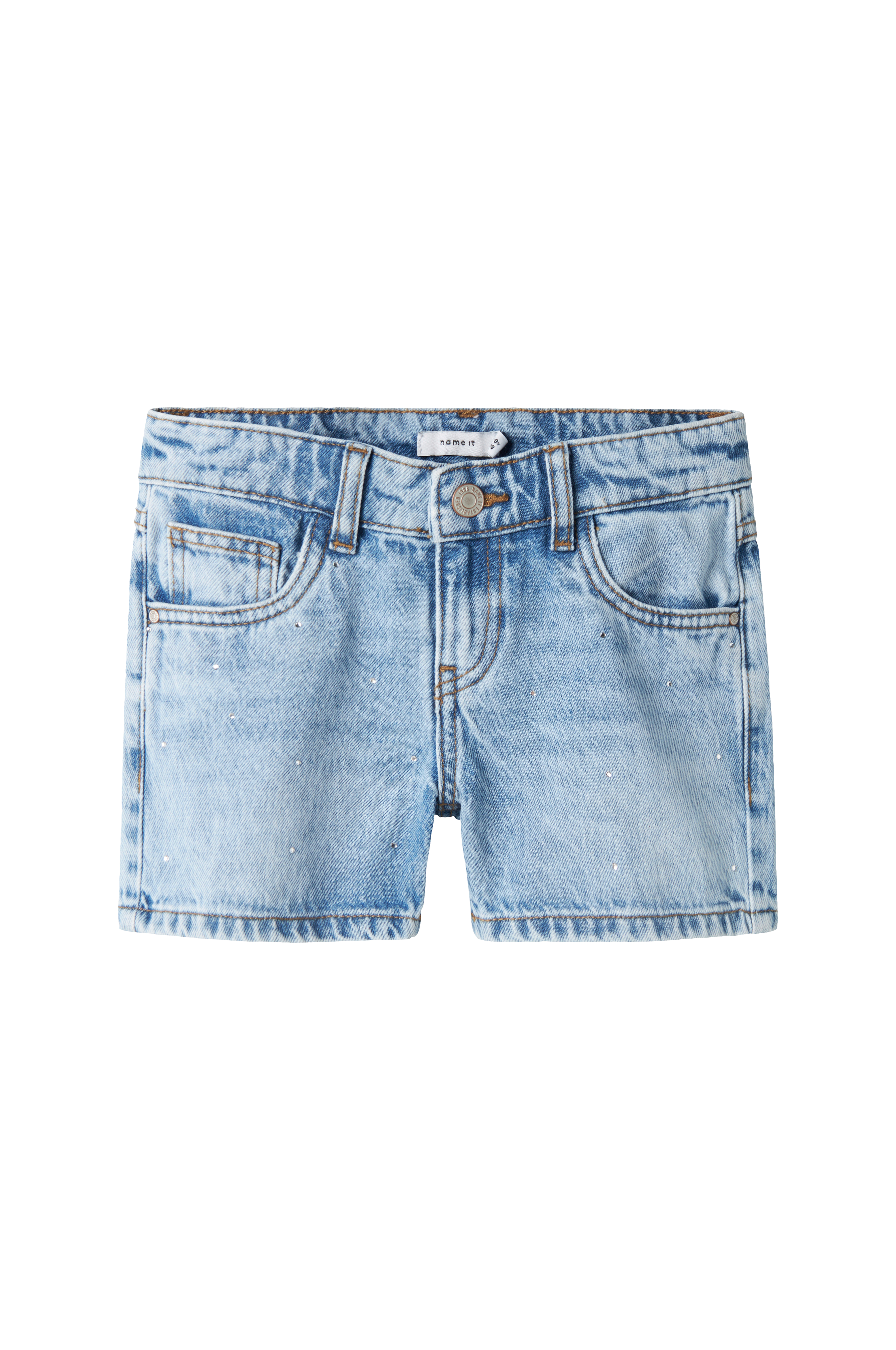 • Denimshorts med glitrende sten foran• Justérbar talje• Femlommemodel• Gylp med lynlås