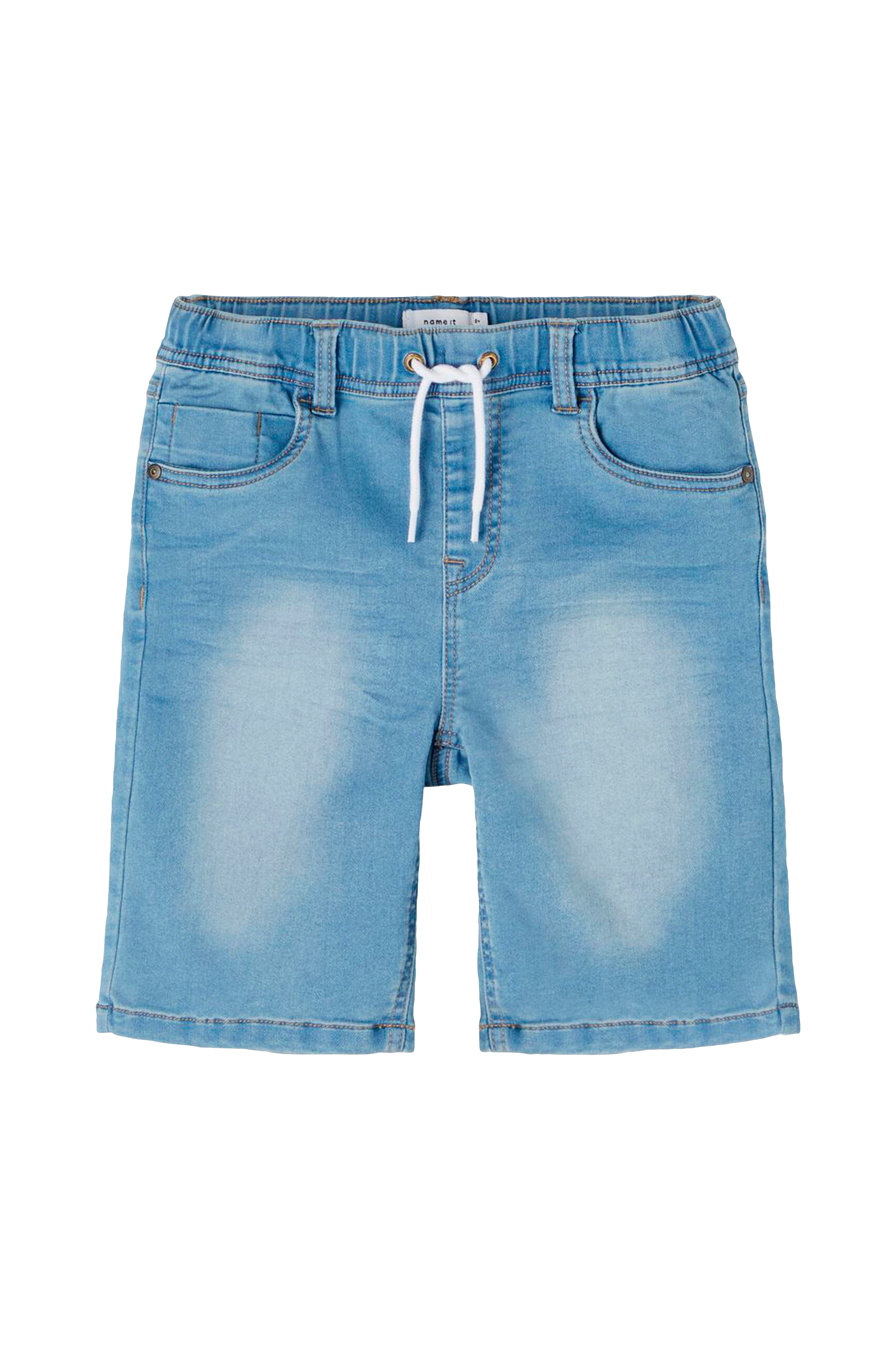Denimshorts i blød sweatdenim med powerstretch. 5-lommemodel med normal pasform. Regulerbar, elastisk talje med løbegang. Ingen gylp.