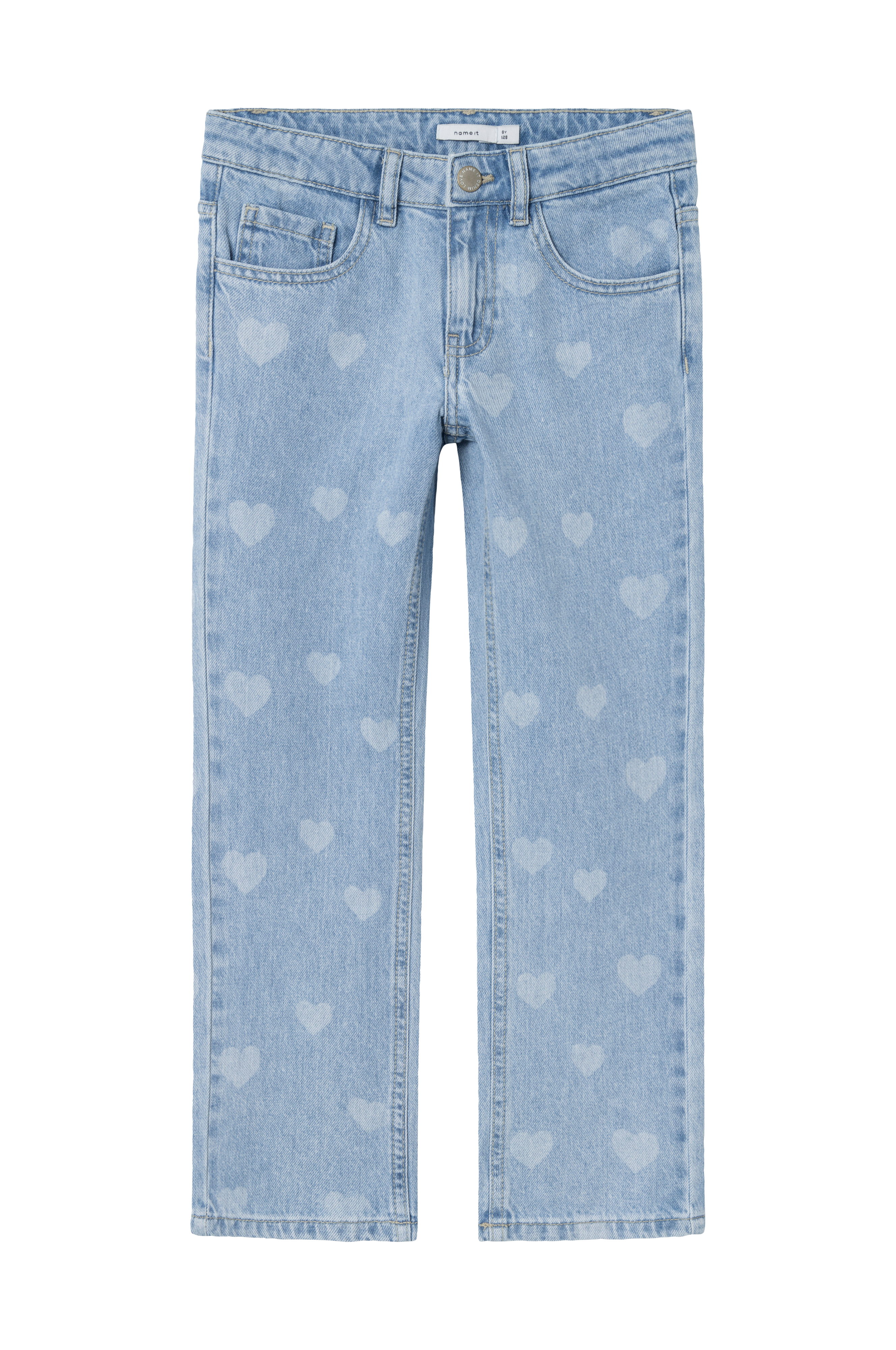 • Normal pasform• Lige ben• Strækdenim med printede hjerter hele vejen rundt• Femlommemodel• Justérbar talje• Gylp med lynlås