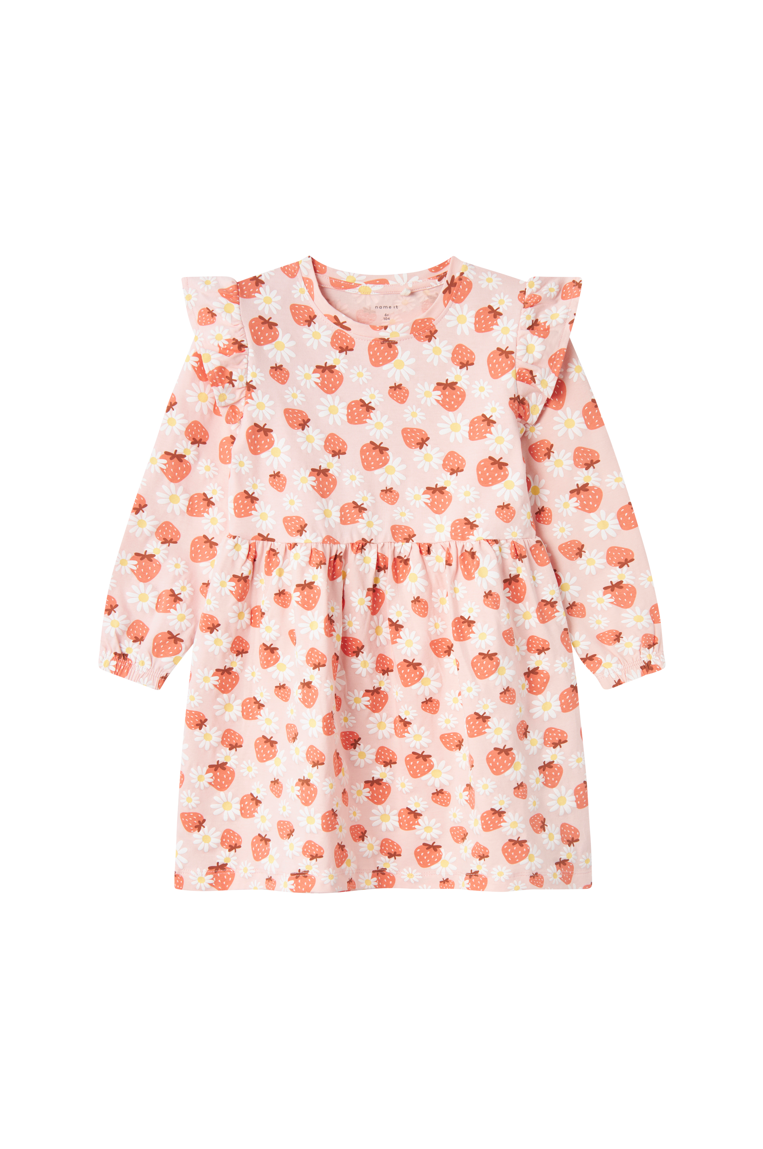 • Kjole i blød, elastisk bomuld• Printet mønster• Lange ærmer med elastisk bånd ved manchetterne• Volanter omkring skuldrene• Elastisk bånd ved taljen