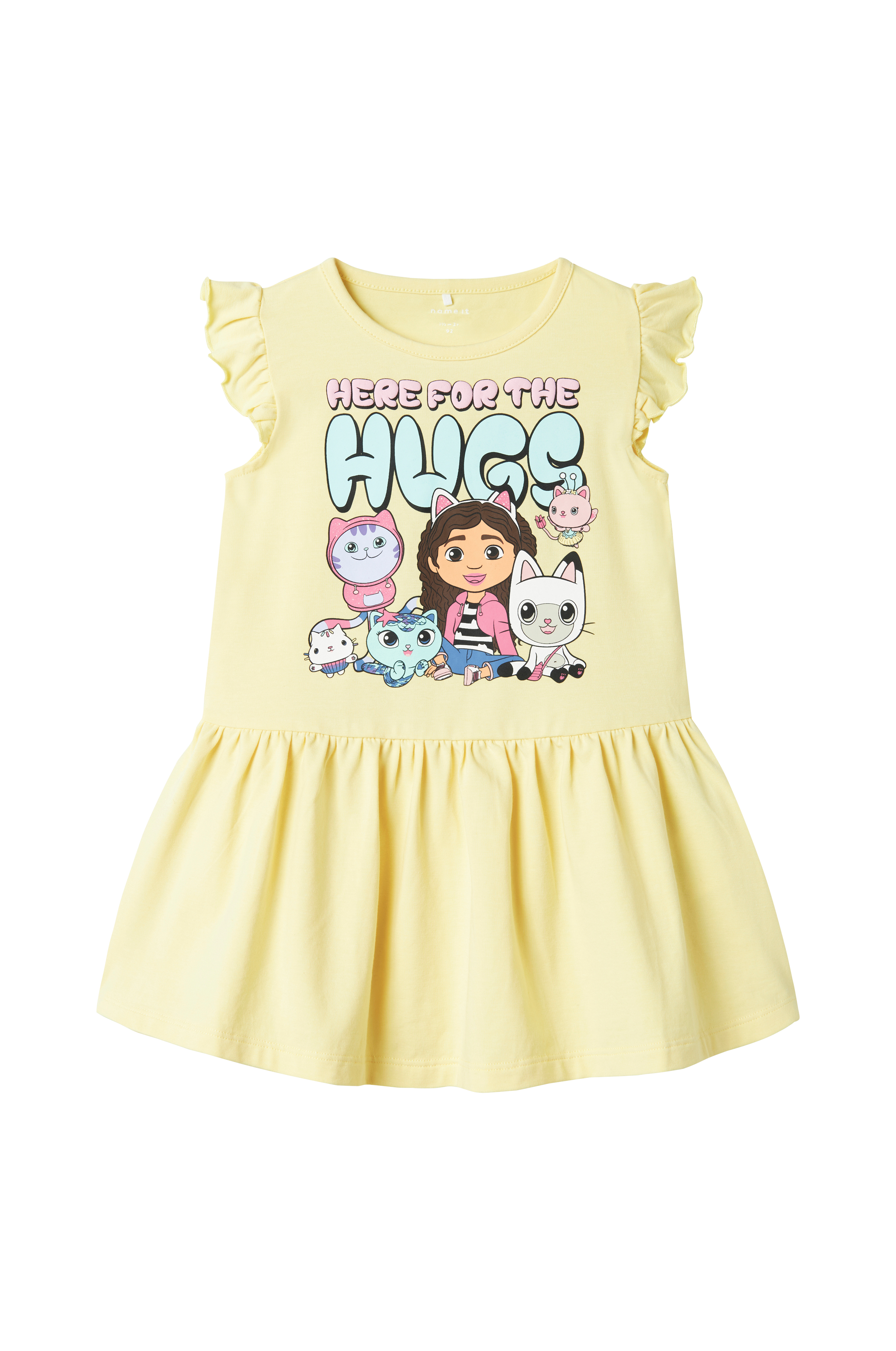 • Kjole i blød, elastisk jersey• Rund hals• Korte flagrende ærmer• Tryk foran• Elastik ved taljen