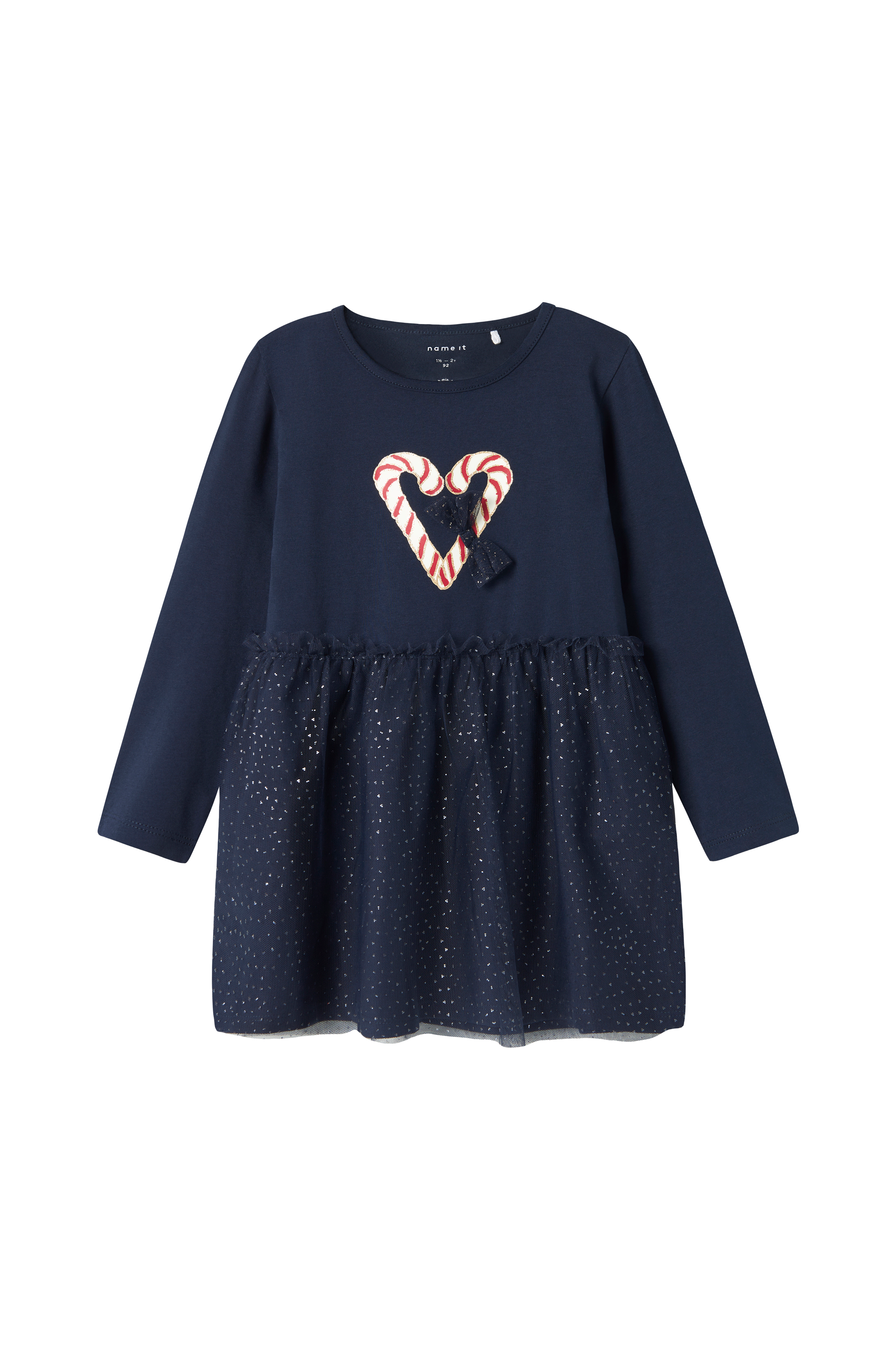 • Model i jersey• Nederdel i mesh med glitrende detaljer• Rund halsudskæring• Printet julemønster med sløjfe i mesh på brystet• Lange ærmer