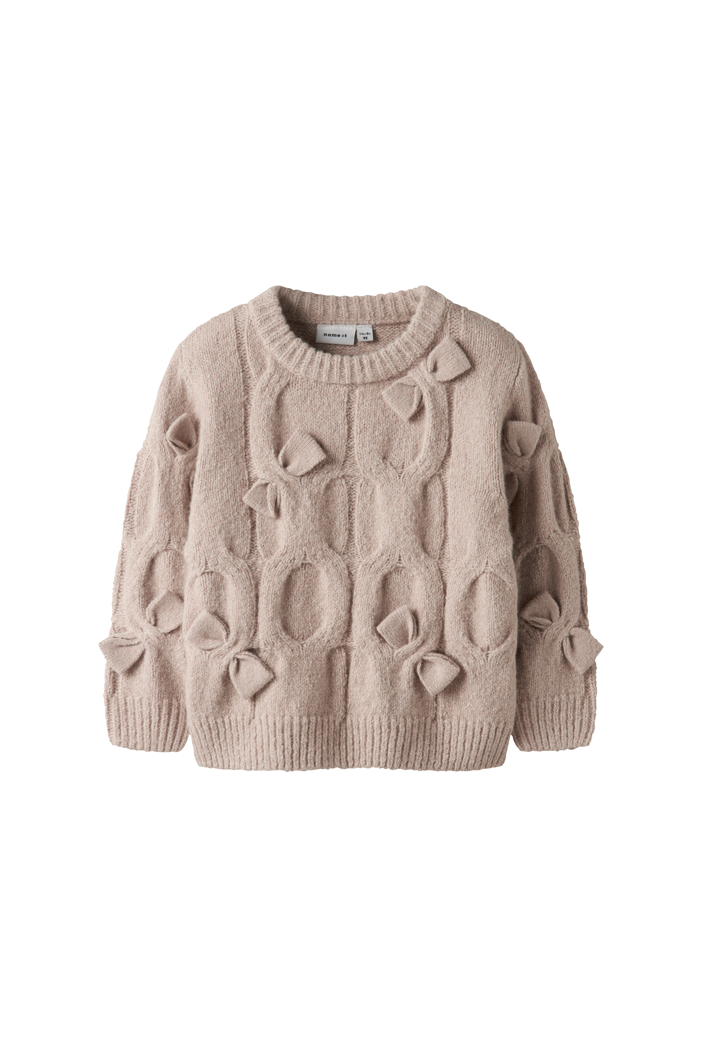• Blød, mønsterstrikket Pullover med dekorative sløjfer ved fronten• Rund, ribbet halsudskæring• Ribstrik ved manchetterne og nederst