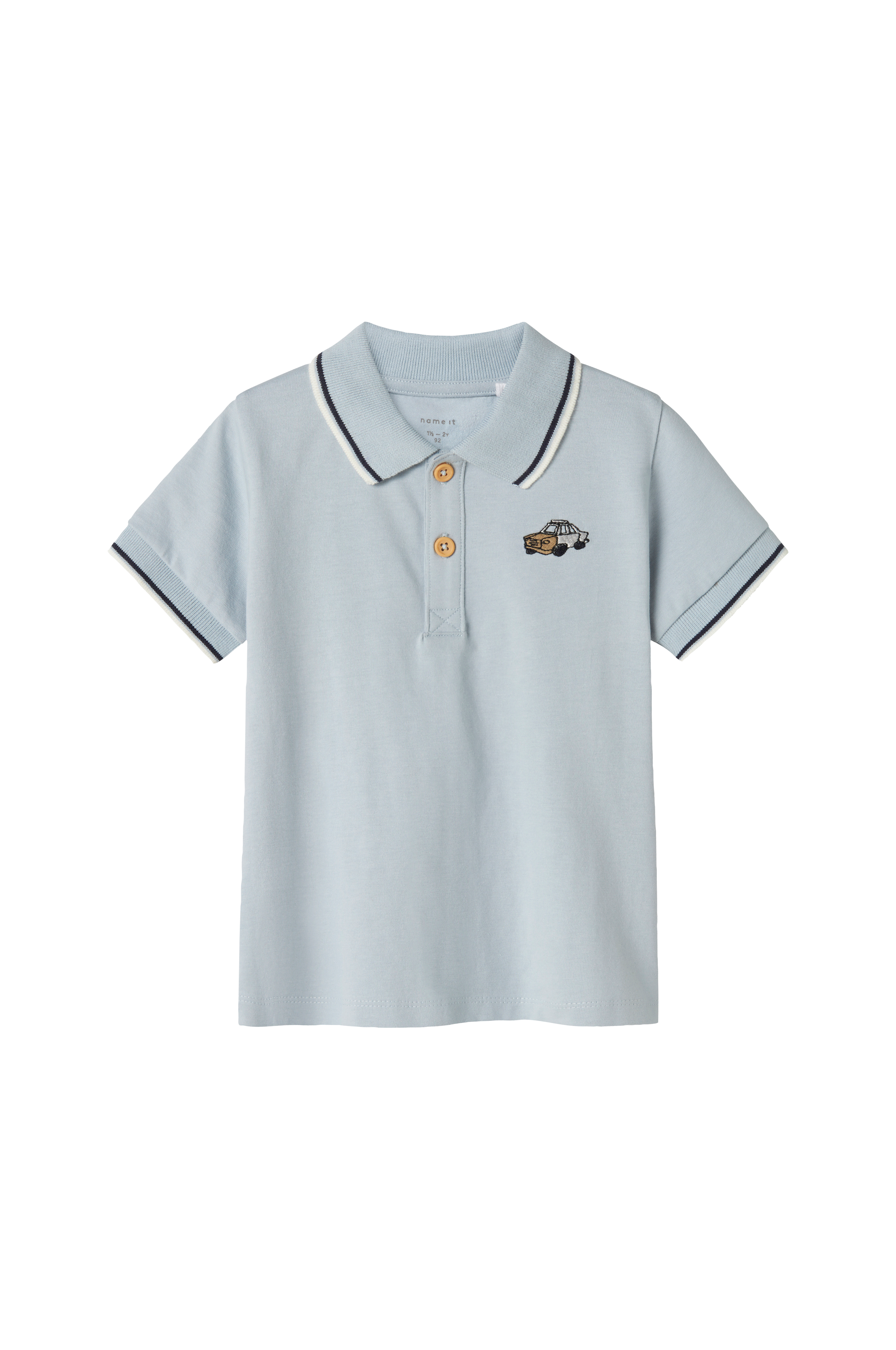 • Ribbet krave• To knapper• Korte ærmer• Broderet motiv på brystet