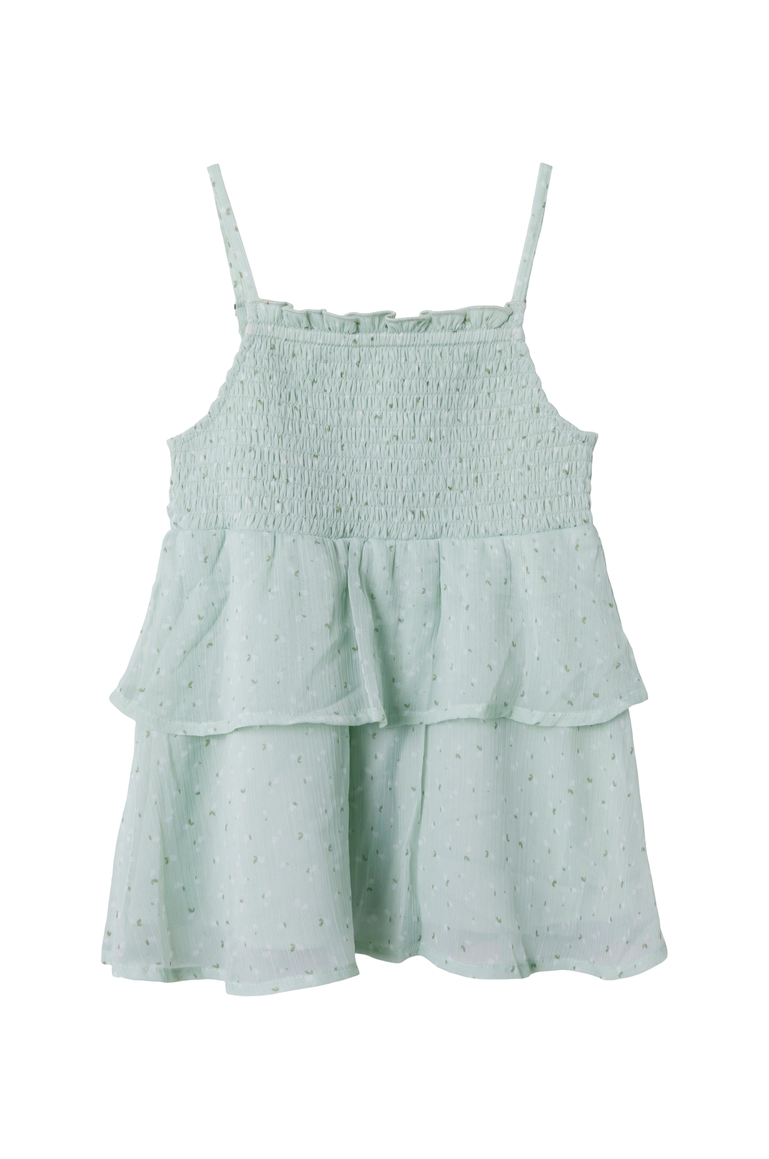 • Ærmeløs top med tynde, justérbare skulderstropper• Smocket øvre del• Transparente volanter ved taljen• For i strækjersey