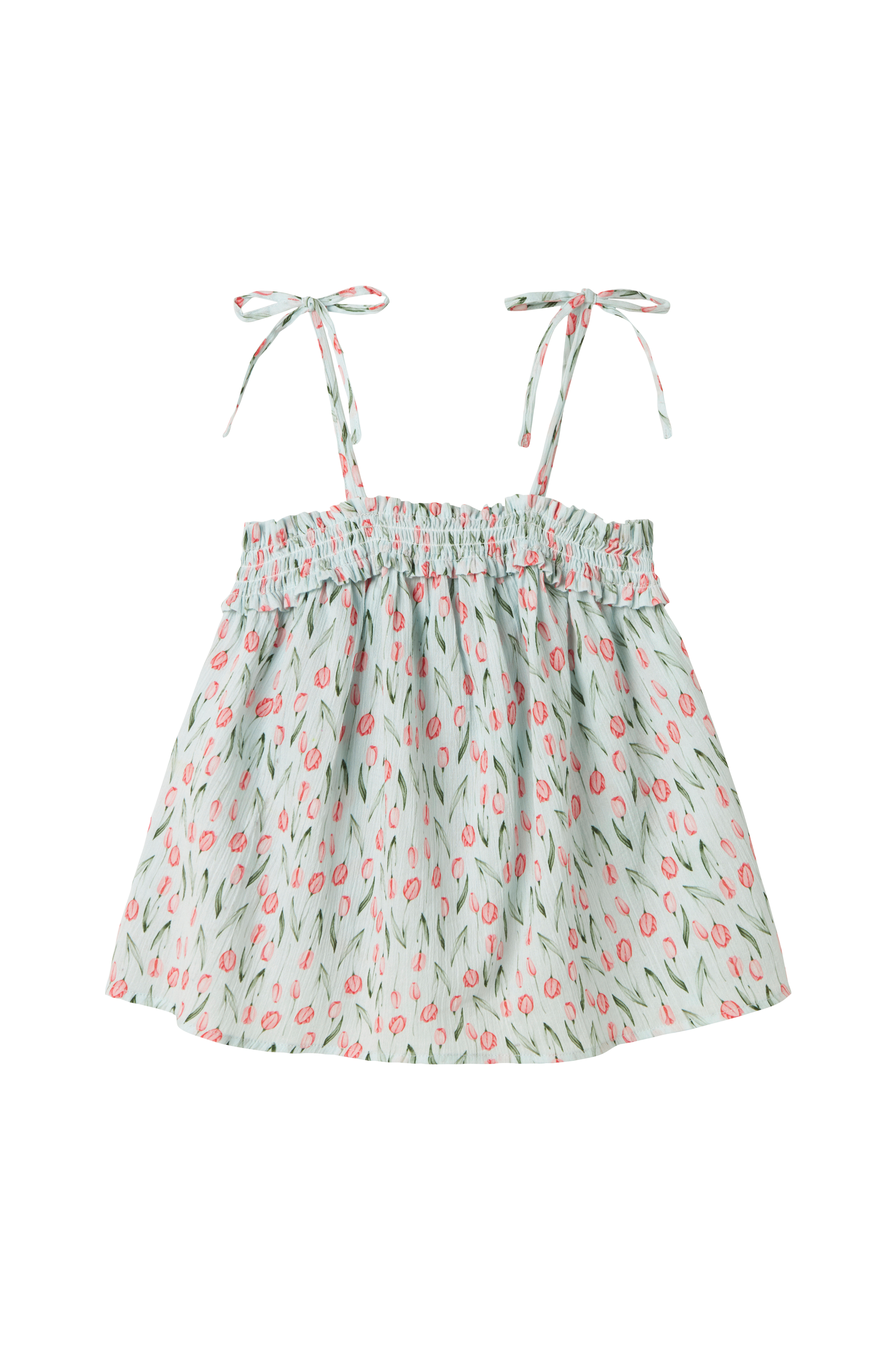 • Ærmeløs top med smocket øvre del• Skulderstropper med påsyede bånd• Smocket øvre del