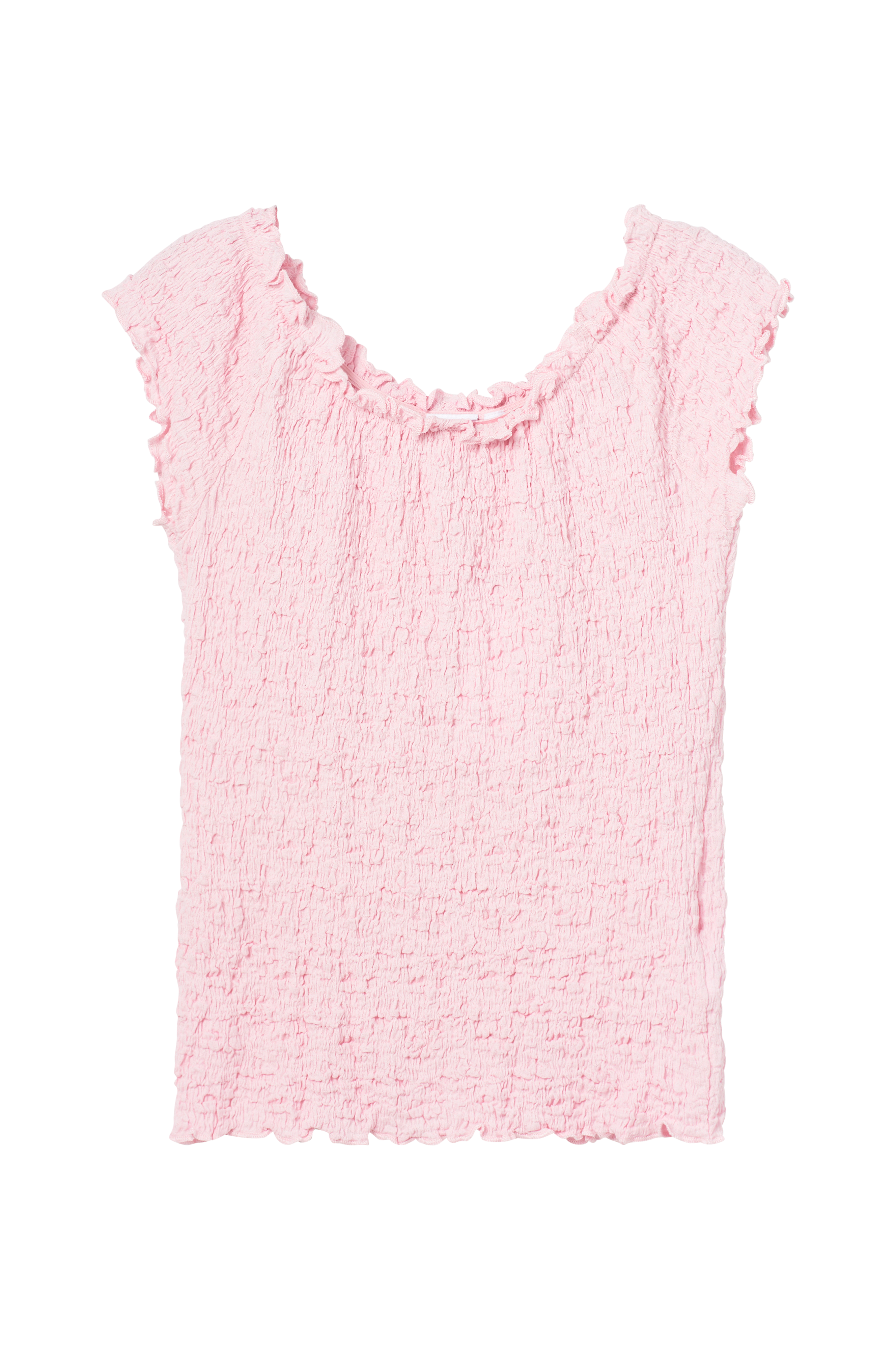• Smocket top• Bred, elastisk halsudskæring med volant• Korte ærmer