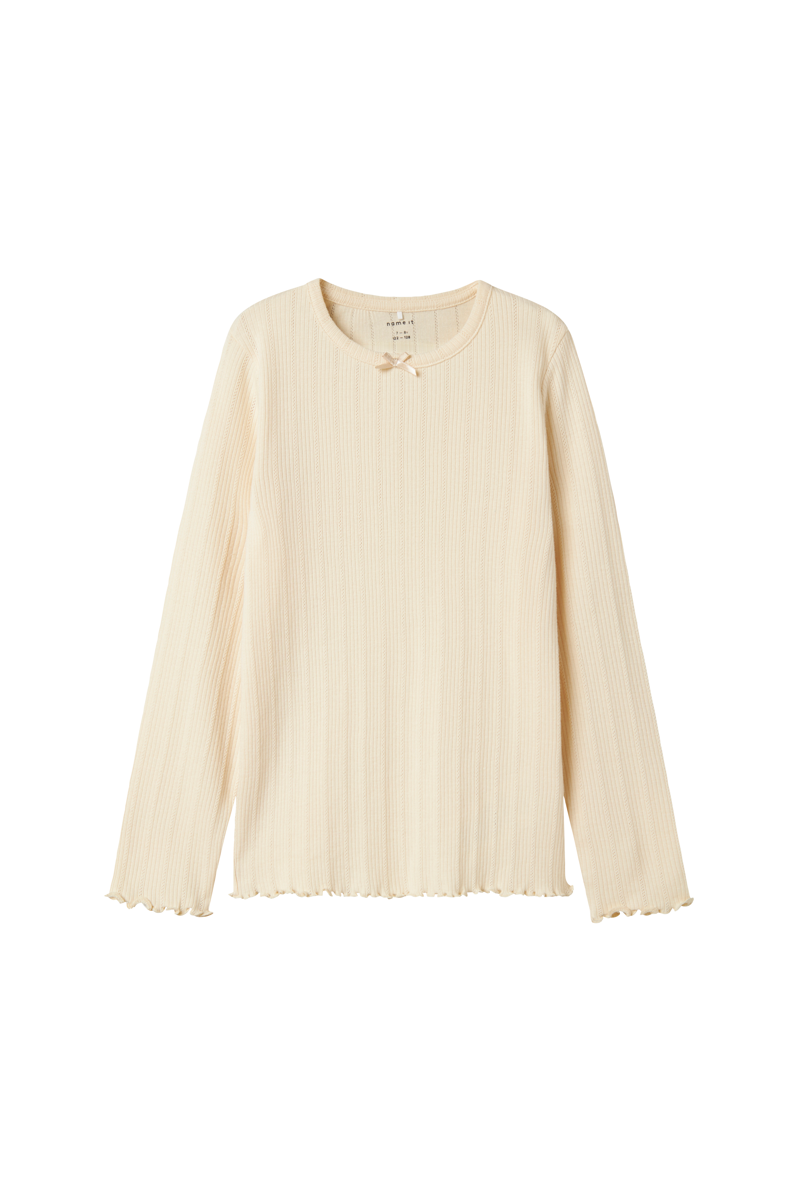 • Langærmet, ribbet top i bomuld• Rund halsudskæring med lille sløjfe foran• Bølgede kanter ved ærmeafslutningerne og ved nederste kant