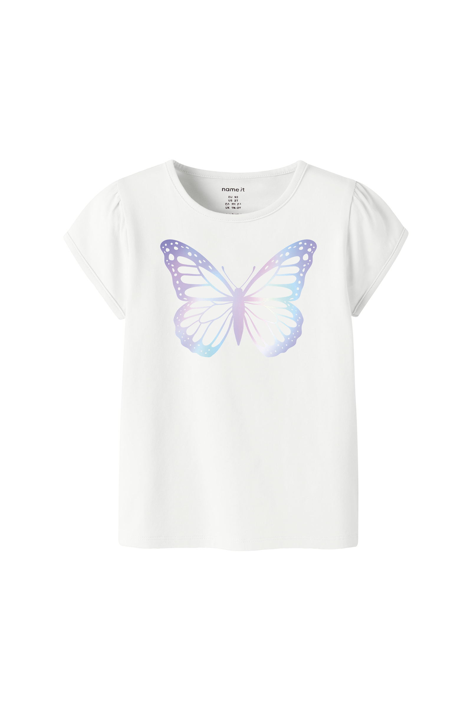 • Top i bomuld• Rund halsudskæring• Korte pufærmer• Skinnende tryk foran