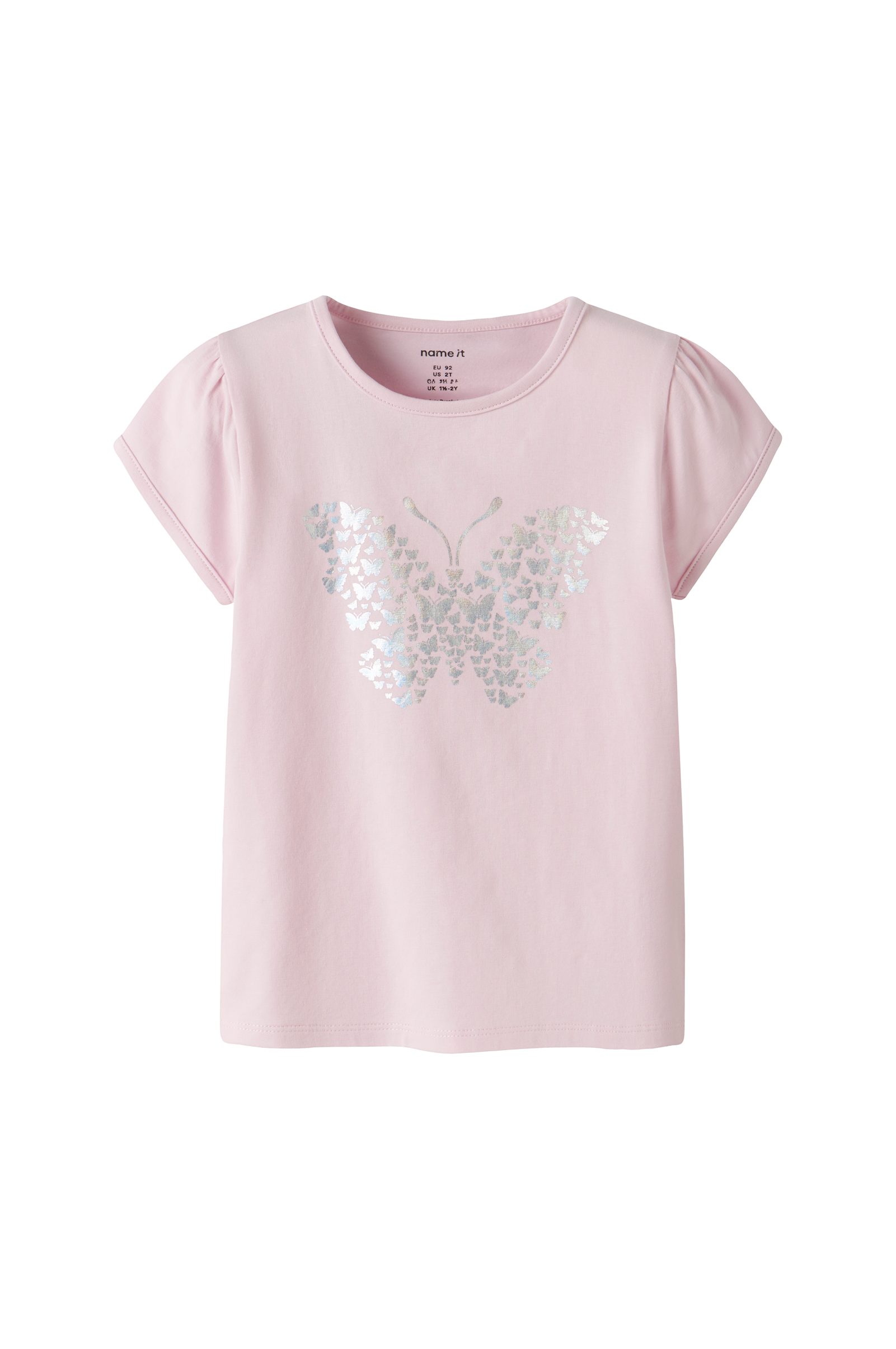 • Top i bomuld• Rund halsudskæring• Korte pufærmer• Skinnende tryk foran