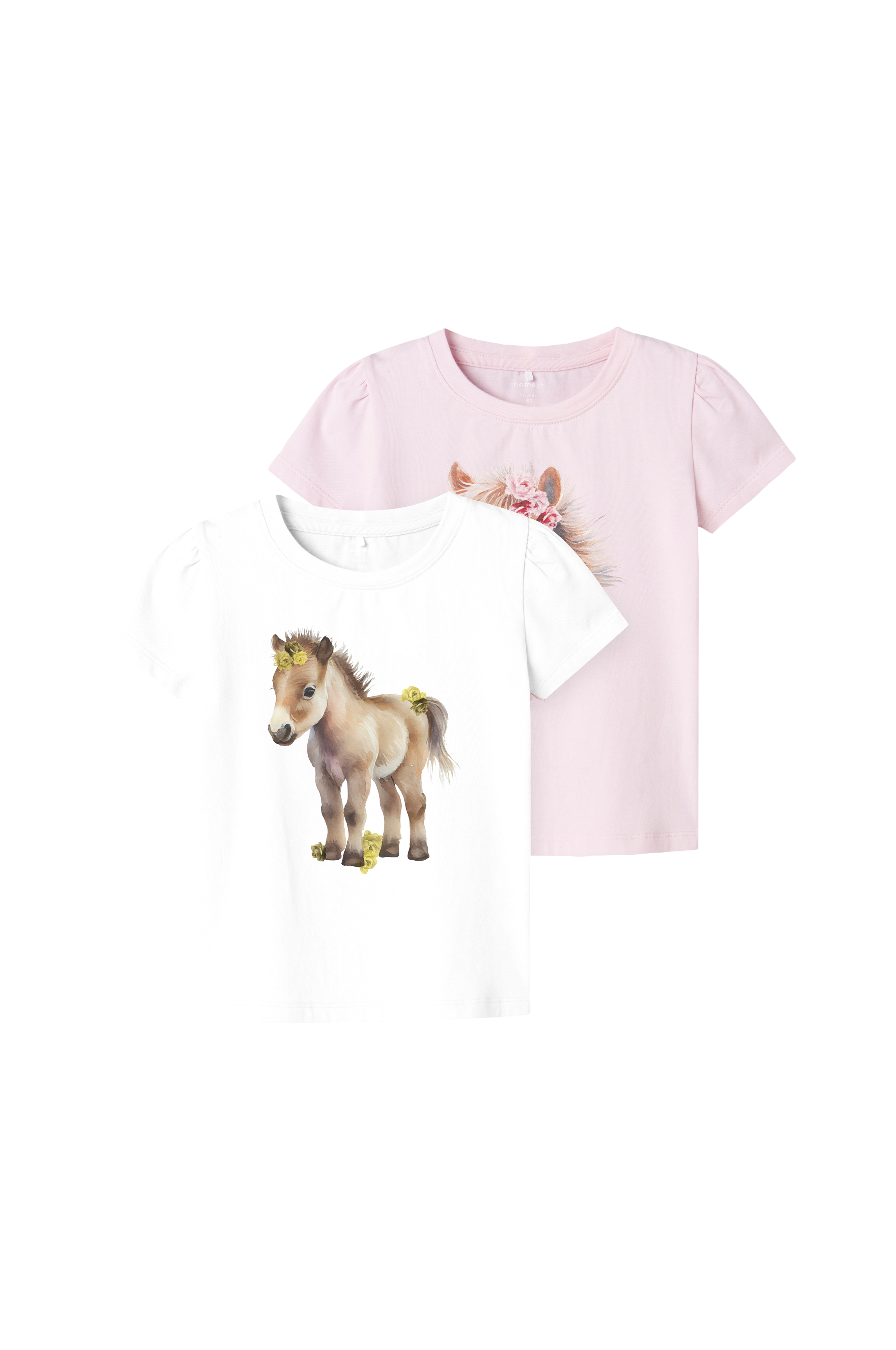 • 2-pak toppe i blød, elastisk bomuld• Rund, ribbet halsudskæring• Korte pufærmer• Tryk foran