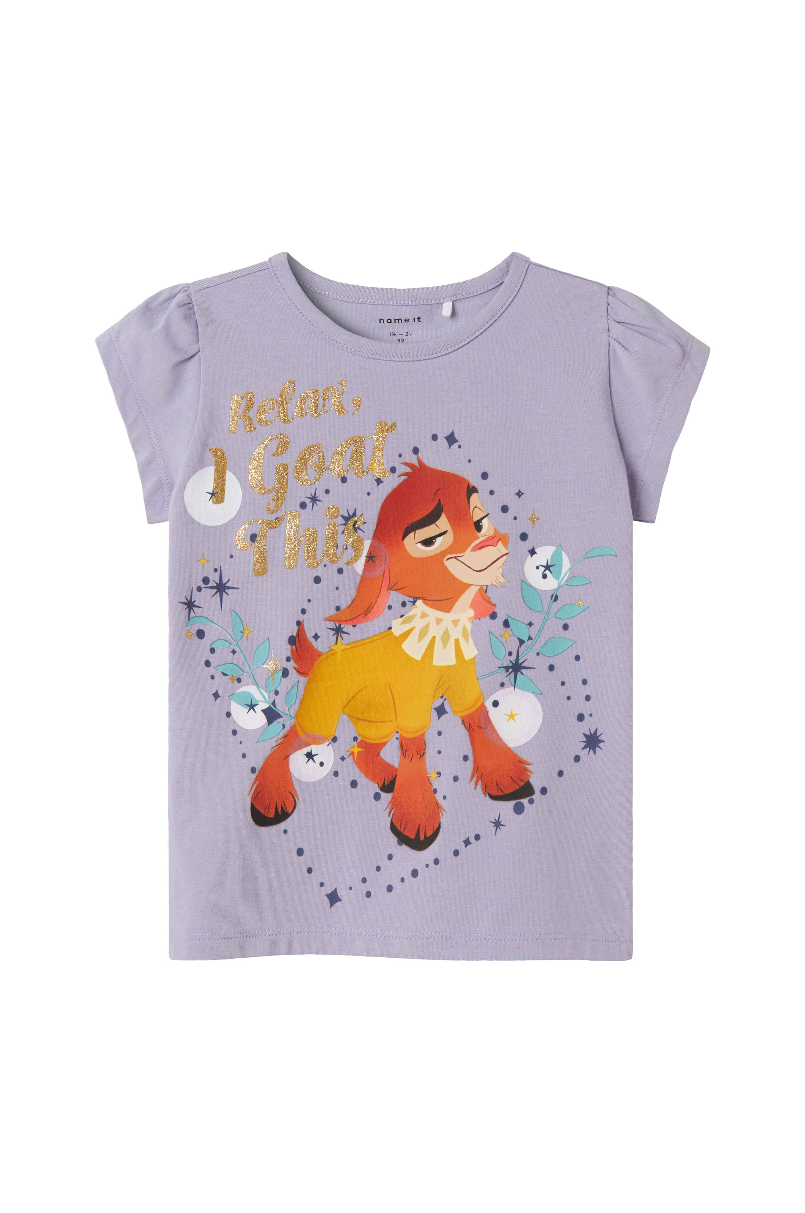 • Top i elastisk bomuld med et glitrende tryk foran• Kort ballonærme