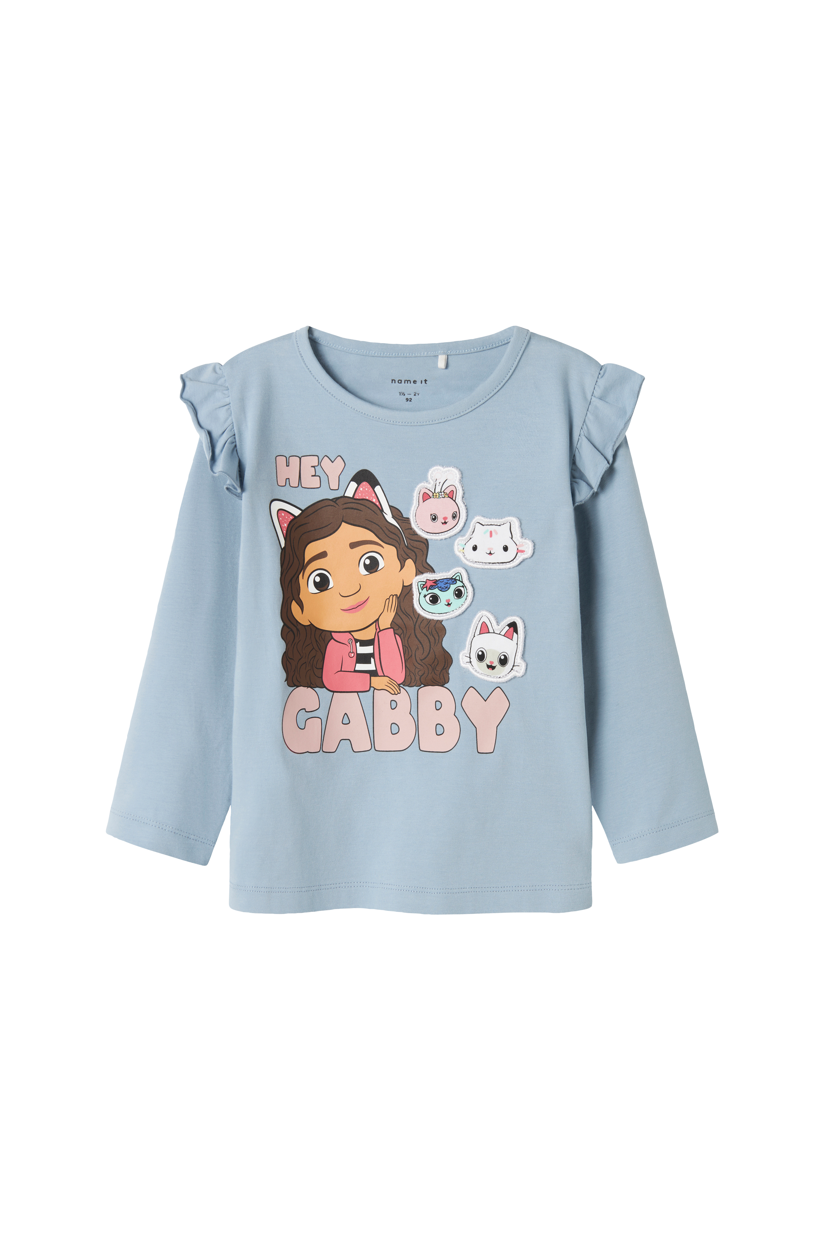 • Top med lapper og tryk foran• Rund halsudskæring• Volant over skuldrene• Lange ærmer• Normal pasform