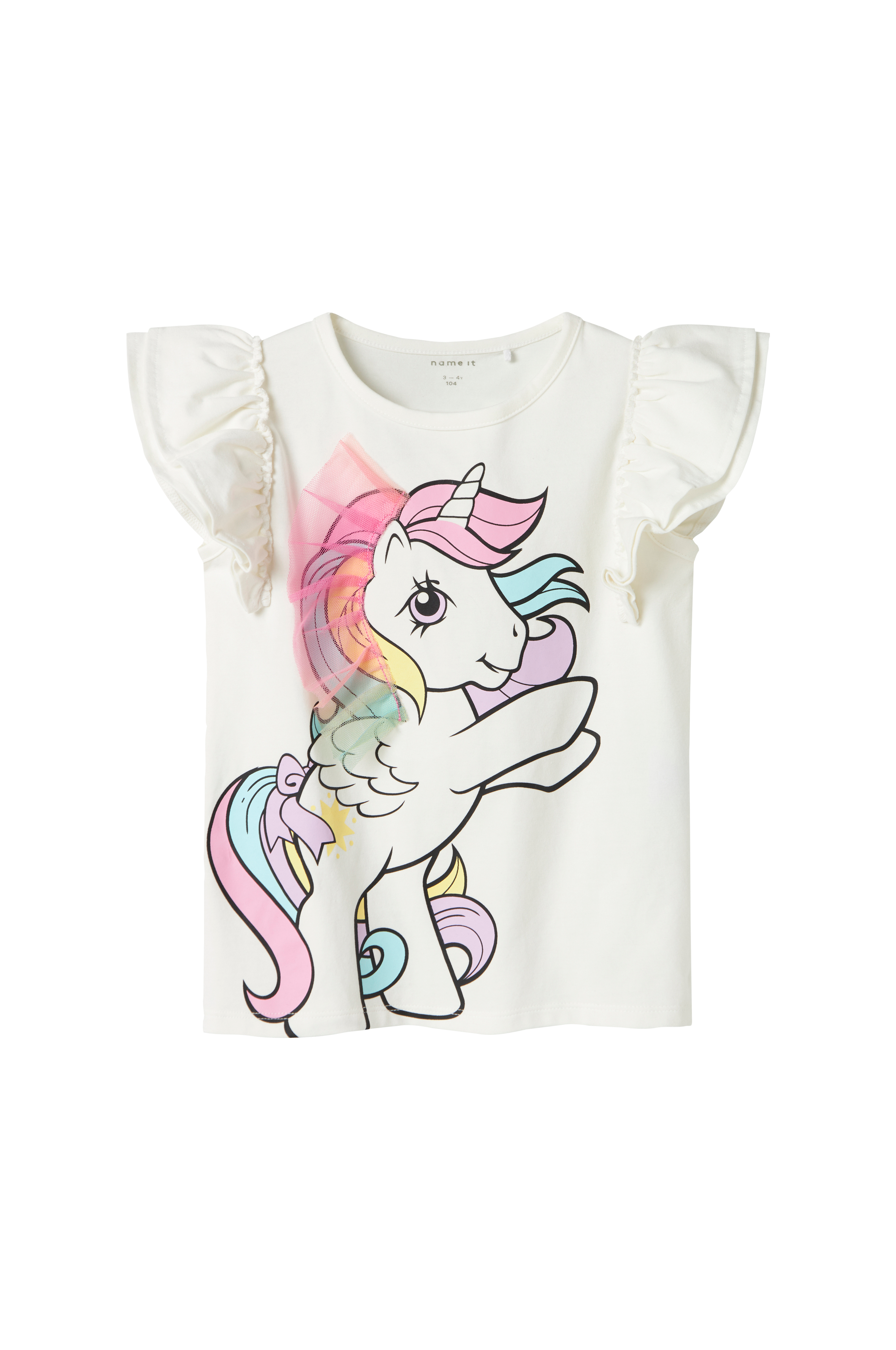 • Top i elastisk bomuld• Rund hals• Korte flagrende ærmer• Tryk foran med detalje i tyl