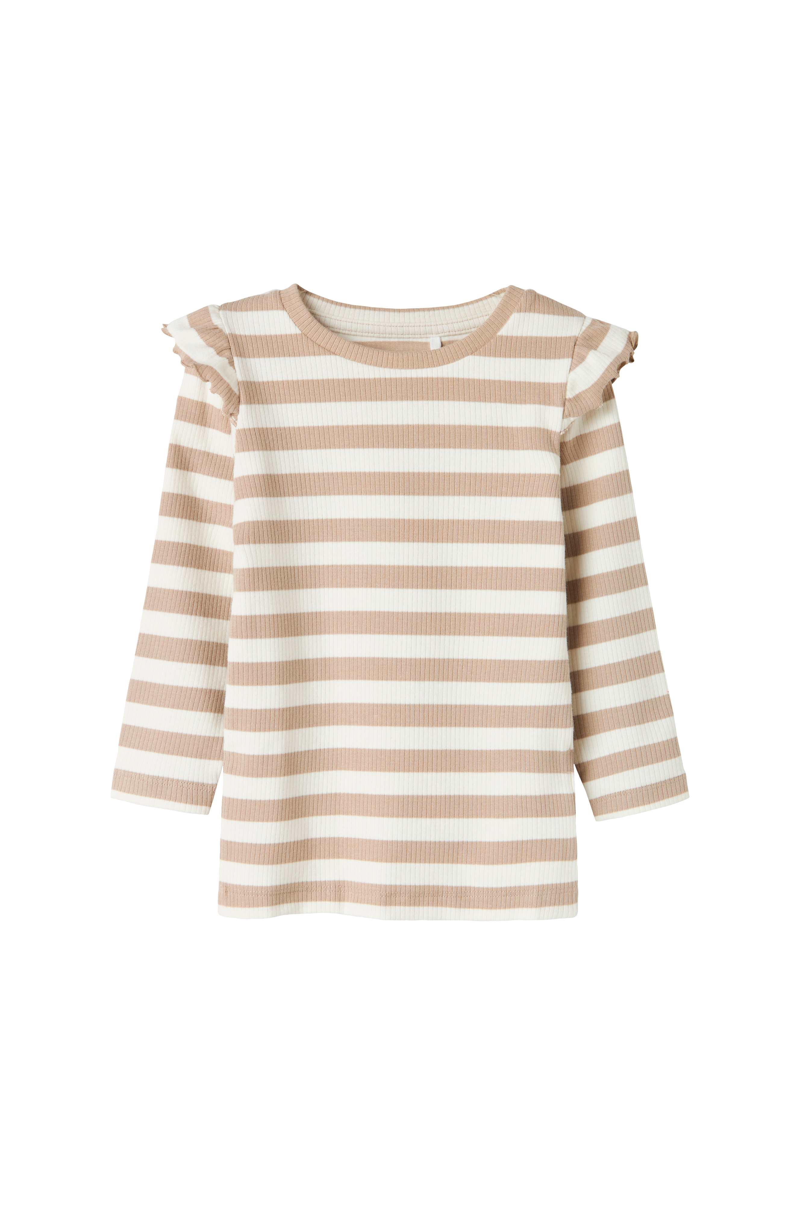 • Top i ribbet, elastisk jersey• Rund halsudskæring• Volanter omkring skuldrene• Smal pasform