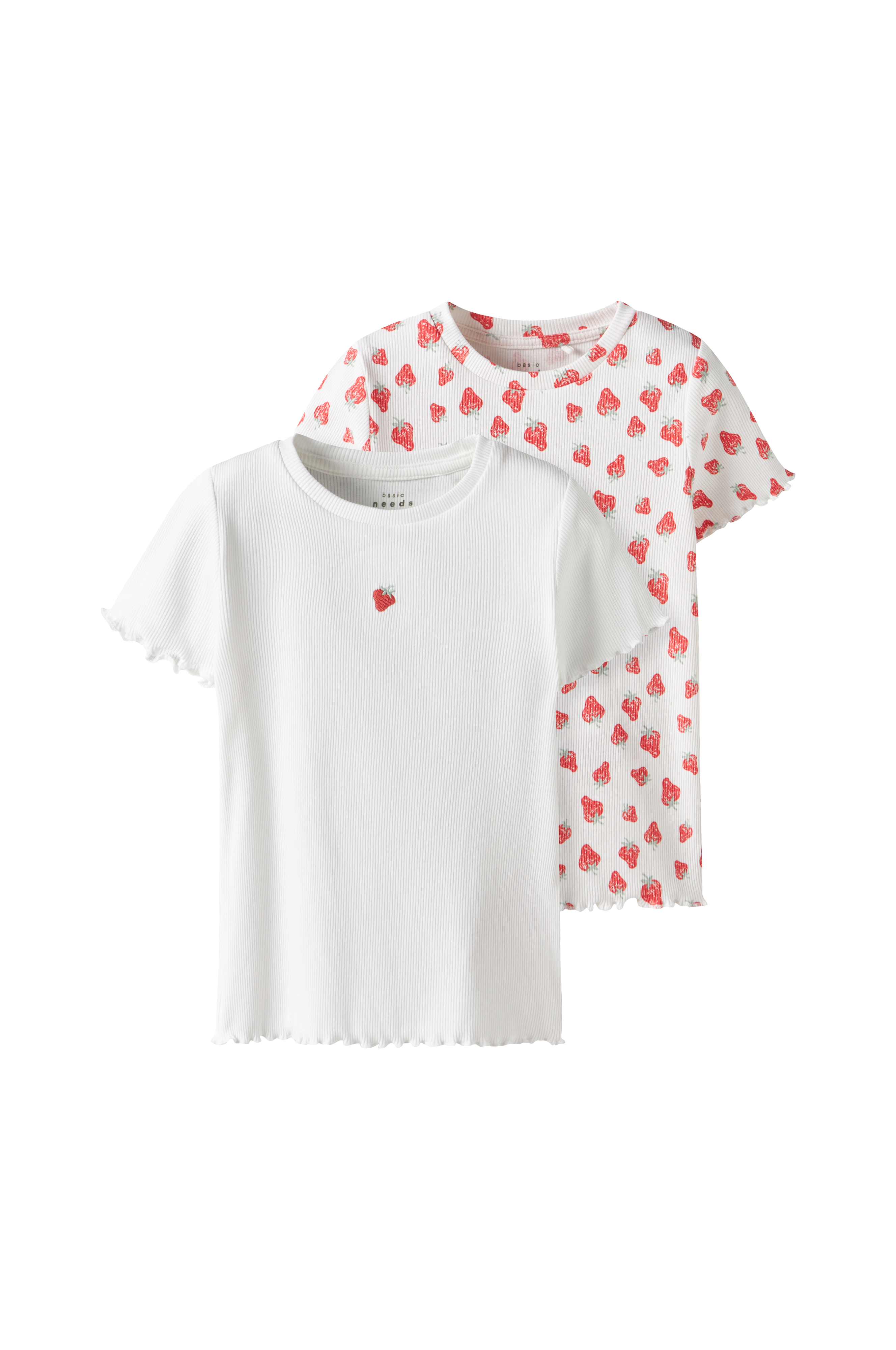 • Kortærmede toppe i ribbet, elastisk bomuld• Rund halsudskæring• Bølgede kanter ved manchetterne og nederst