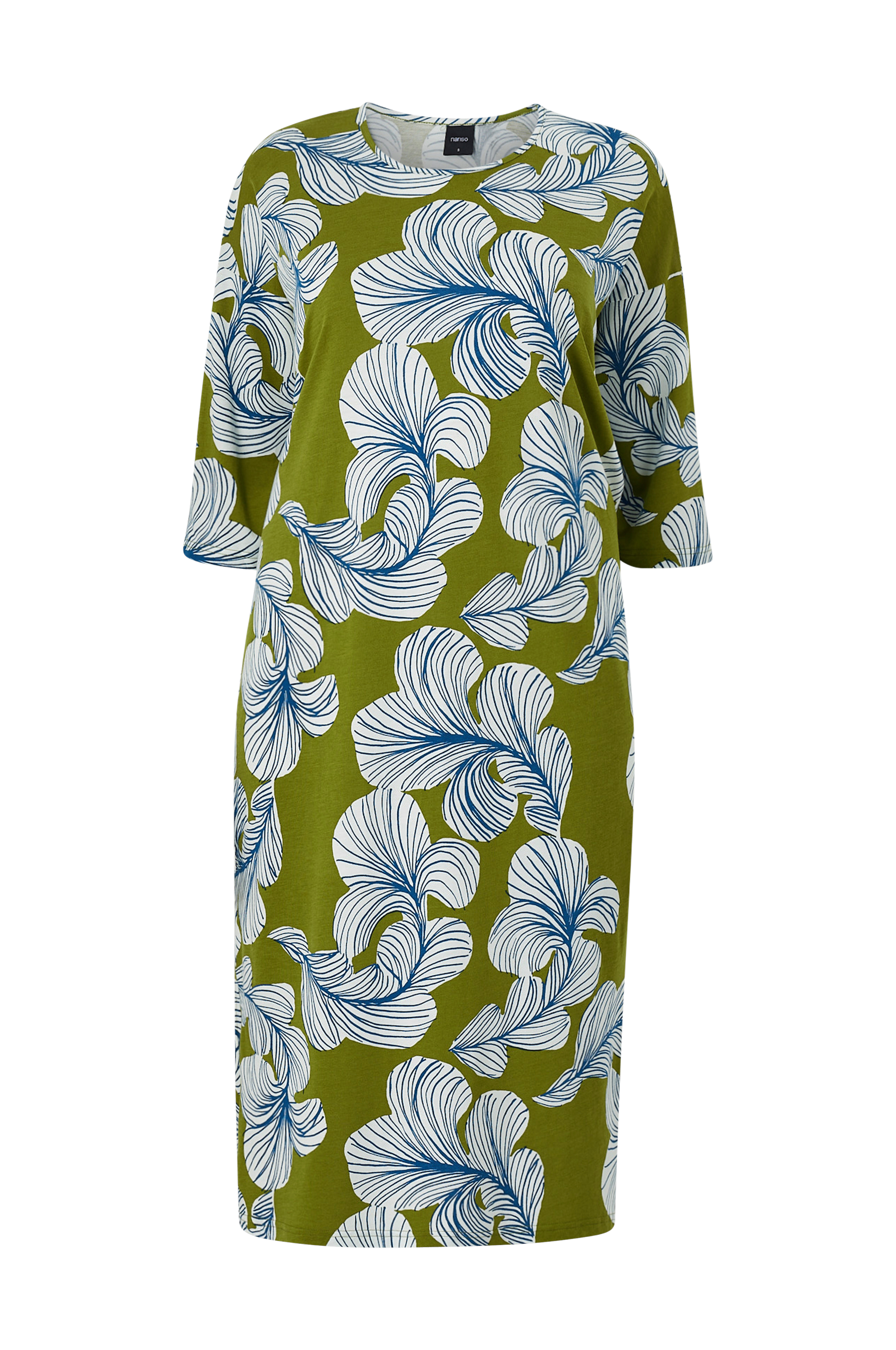 • Lang, lige model• Nedsænket skulder med bredt ærme• Rund hals med lille kant