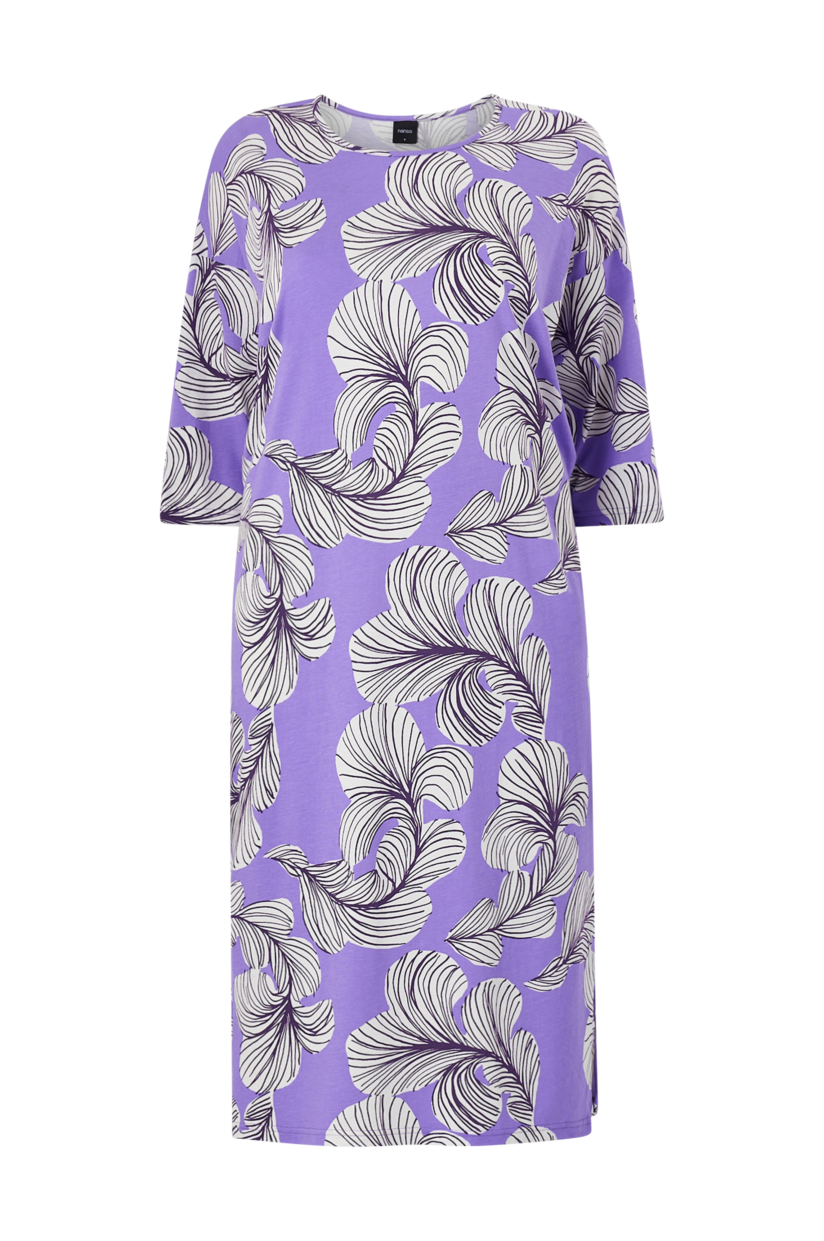 • Lang, lige model• Nedsænket skulder med bredt ærme• Rund hals med lille kant