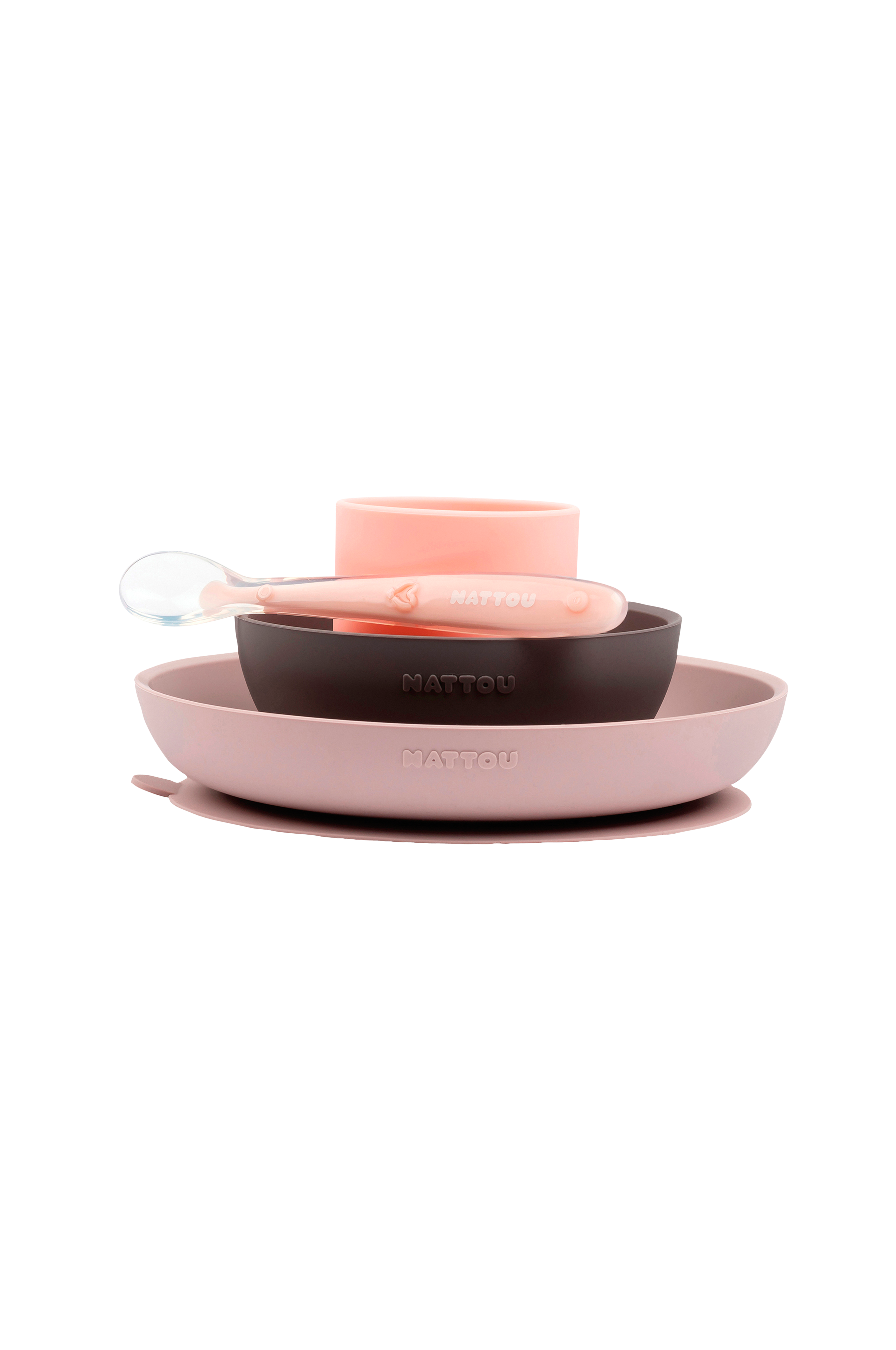 Takket være en sugekop på undersiden står tallerken og skål fast på bordet. De lige kanter gør det nemt at få maden op på skeen.