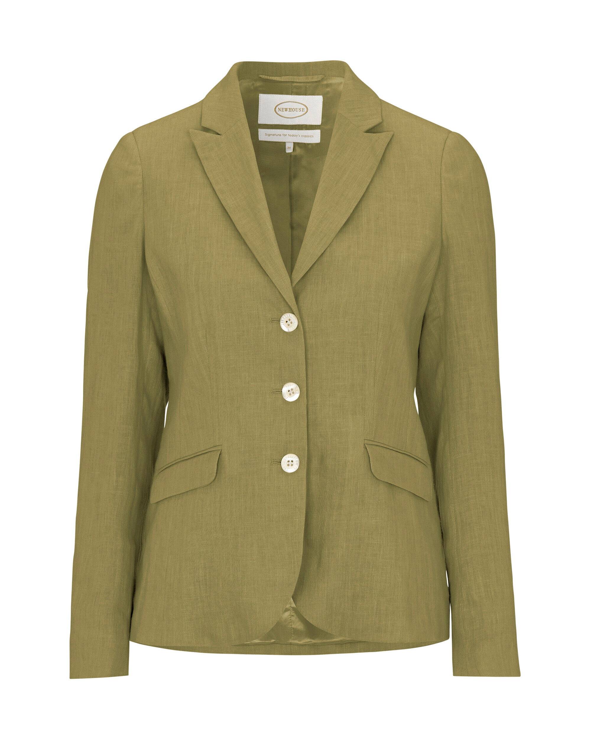 Klassisk, velforarbejdet hørblazer med tre knapper i en flatterende pasform. Blazeren er fuldt foret med et smagfuldt udvalgt for og kontrastfarvet piping og lukkes med perlemorsknapper.