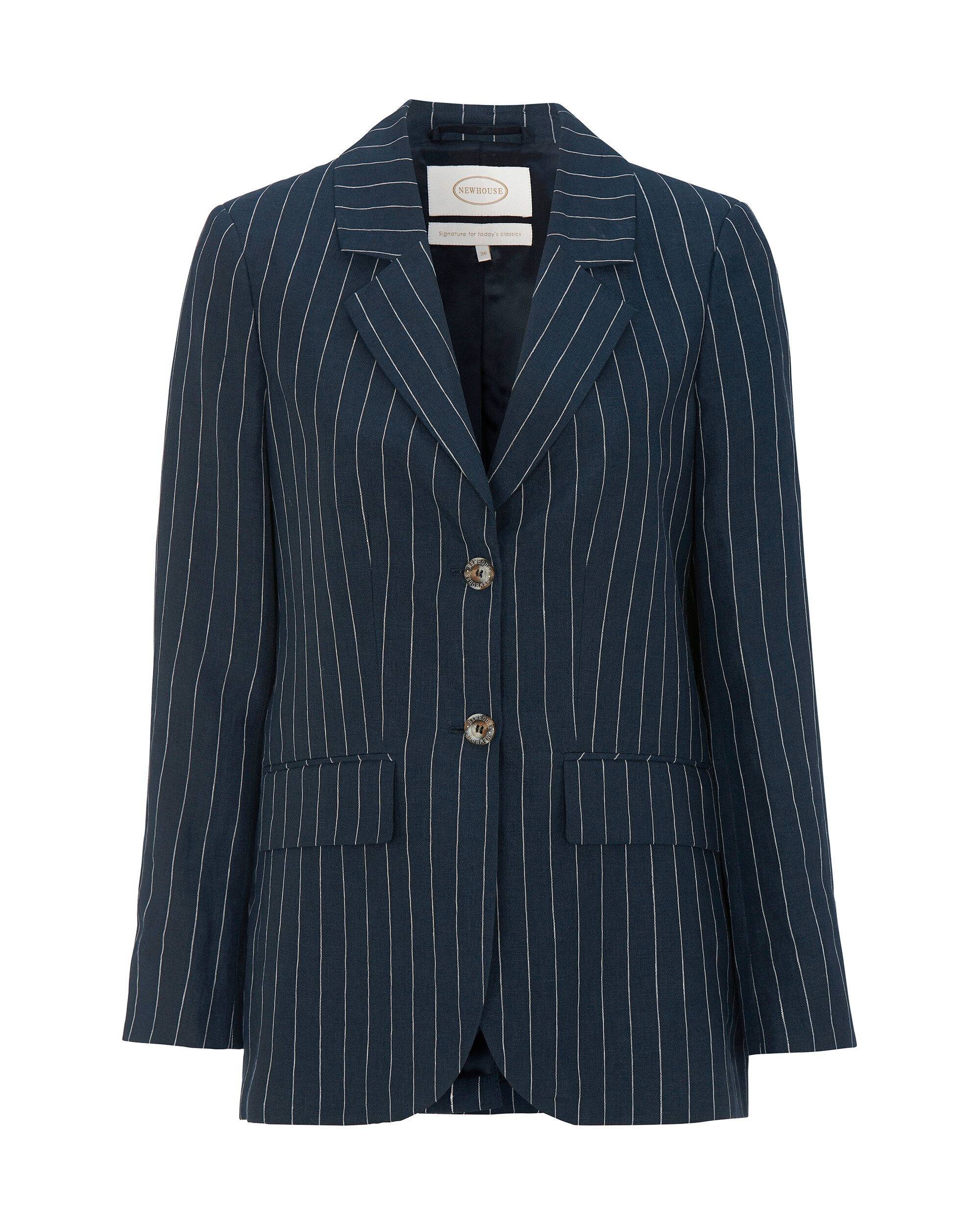 Eksklusiv blazer i italiensk hørstof med et stilfuldt pinstripe -mønster. Designet til et afslappet, men sofistikeret look.