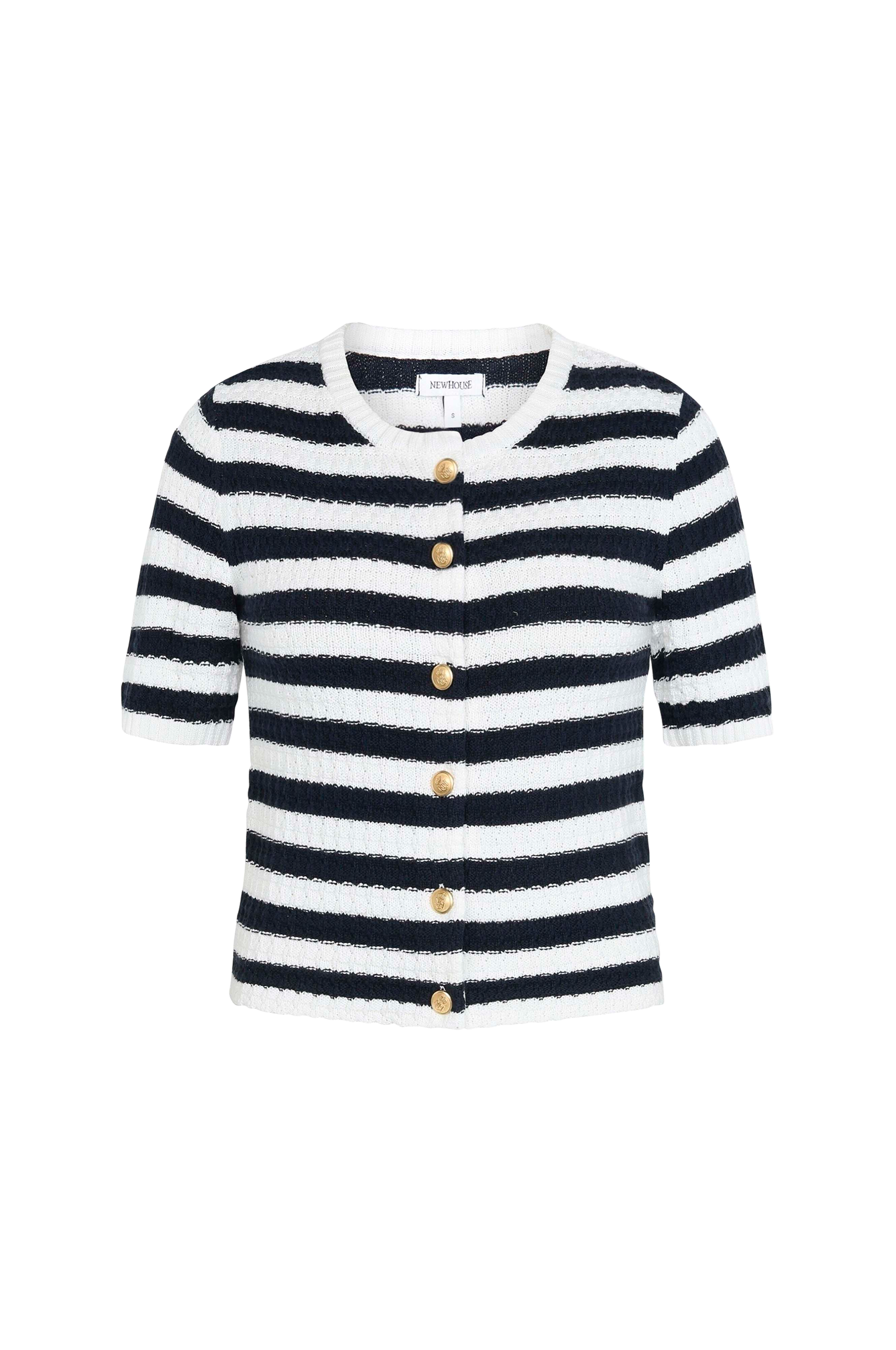 Strikket cardigan med korte ærmer og en dekorativ struktur i 5 gauge. Stribet design med logoknapper i guldmetal.