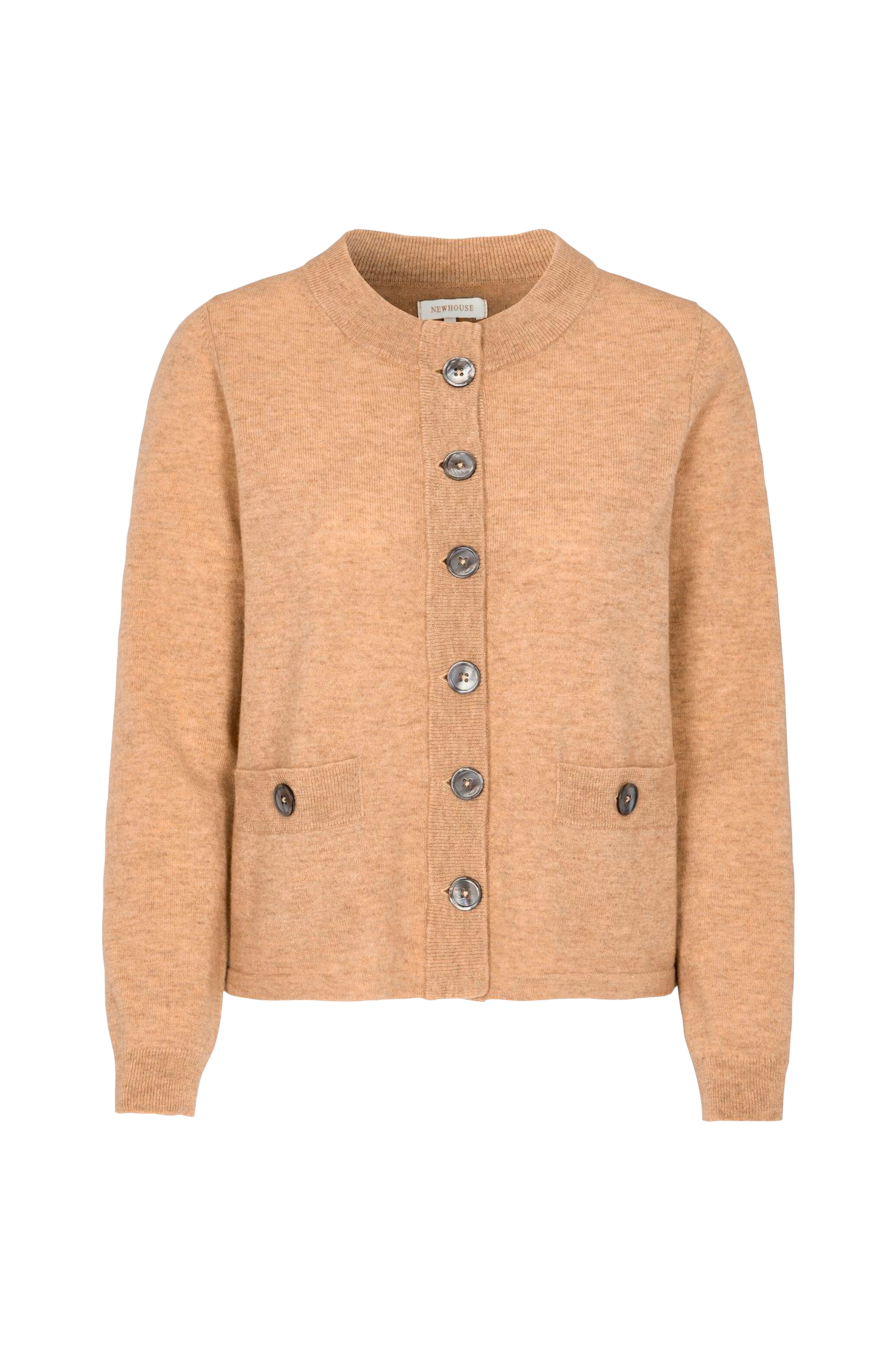 Rundhalset cardigan i lammeuld med stilfulde detaljer. Cardiganen har to dekorative forlommer og store knapper i røggrå perlemor.