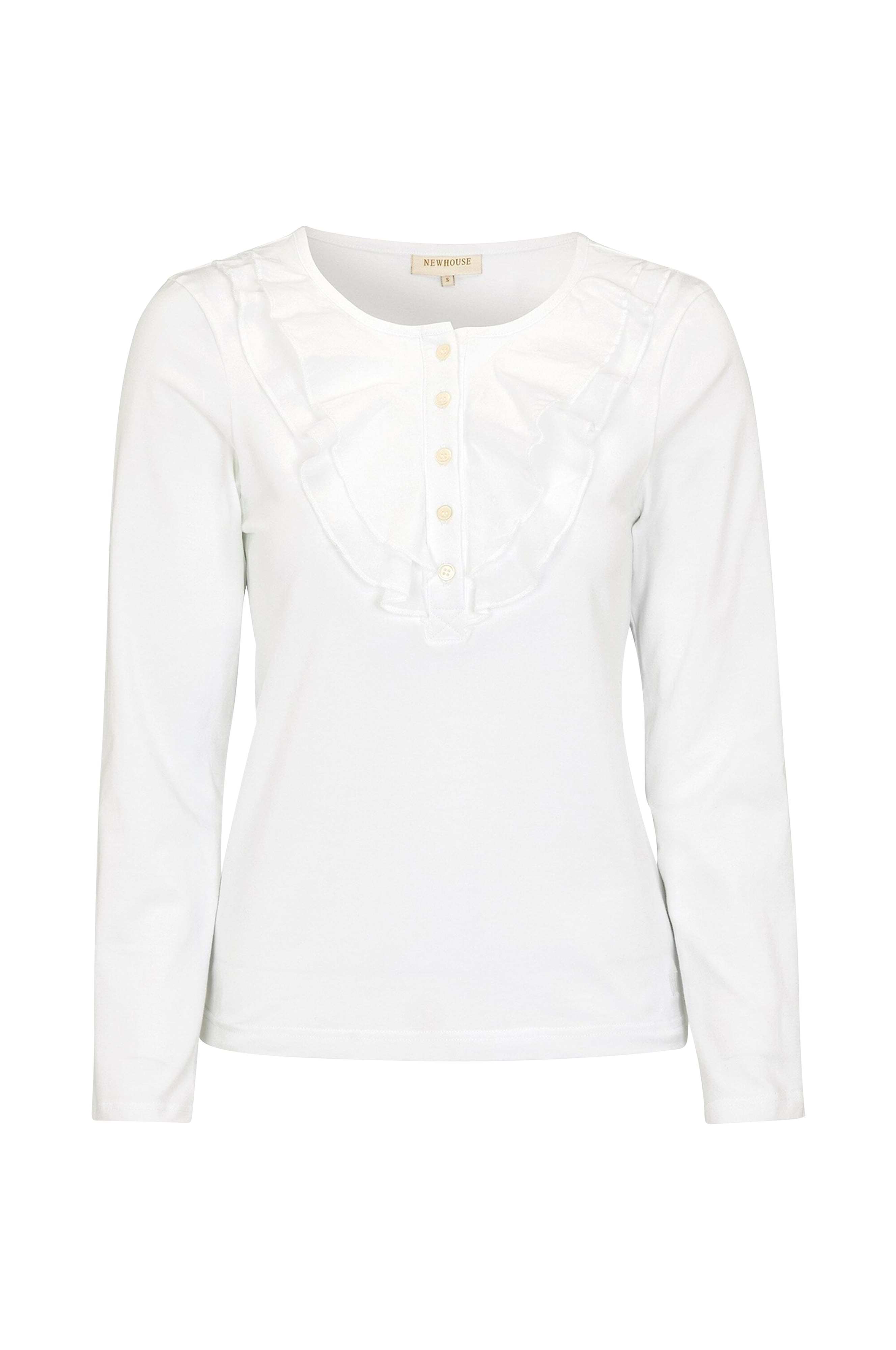 En langærmet top med dekorative flæser og knaplukning på brystet. Toppen er fremstillet i en bomuld/elastan-blanding, som giver en behagelig og stilfuld pasform.