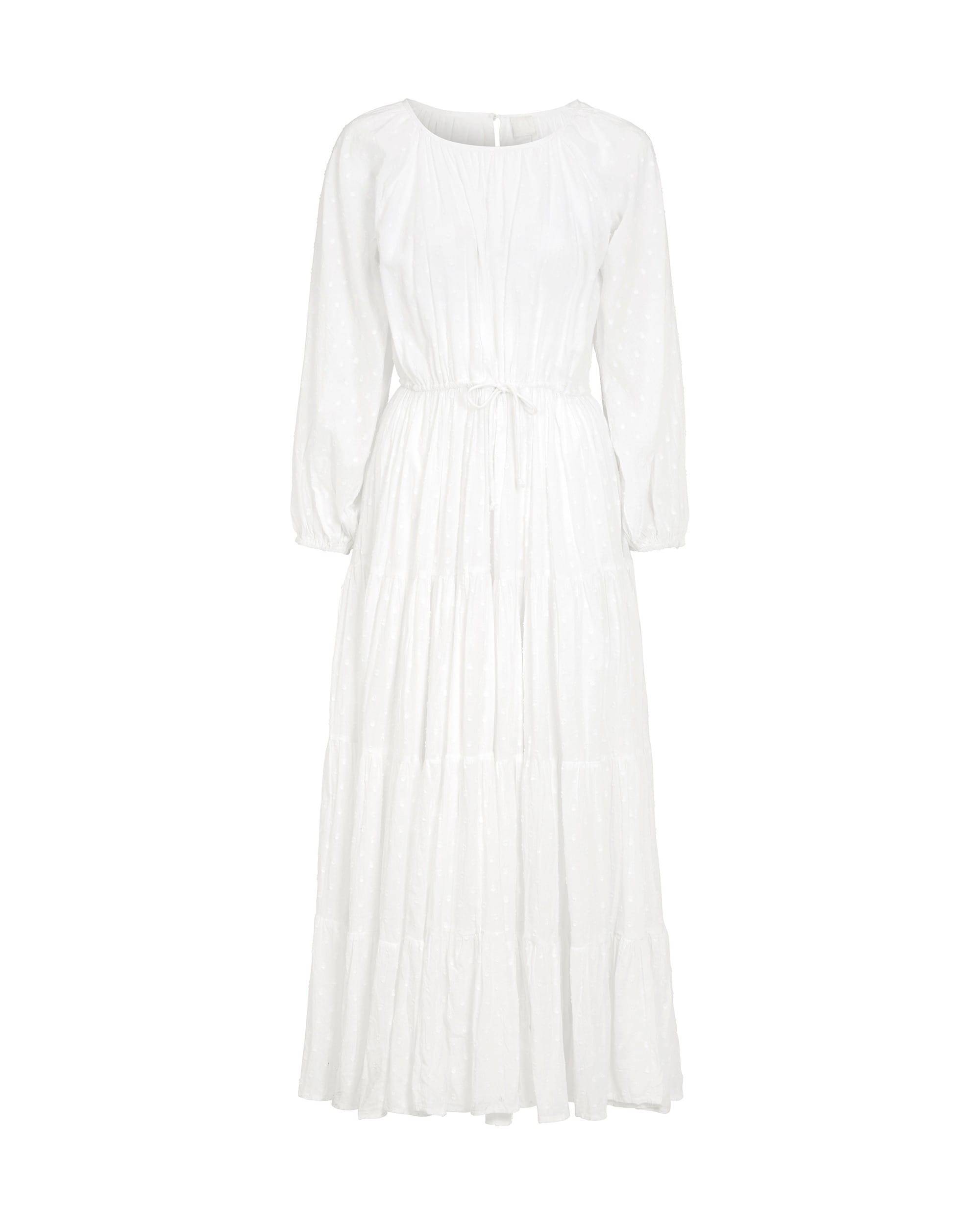 Kjole i fuld længde i bomuldsvoile med vævede prikker. Kjolen har elastik og snøre i taljen og er foret med bomuld.