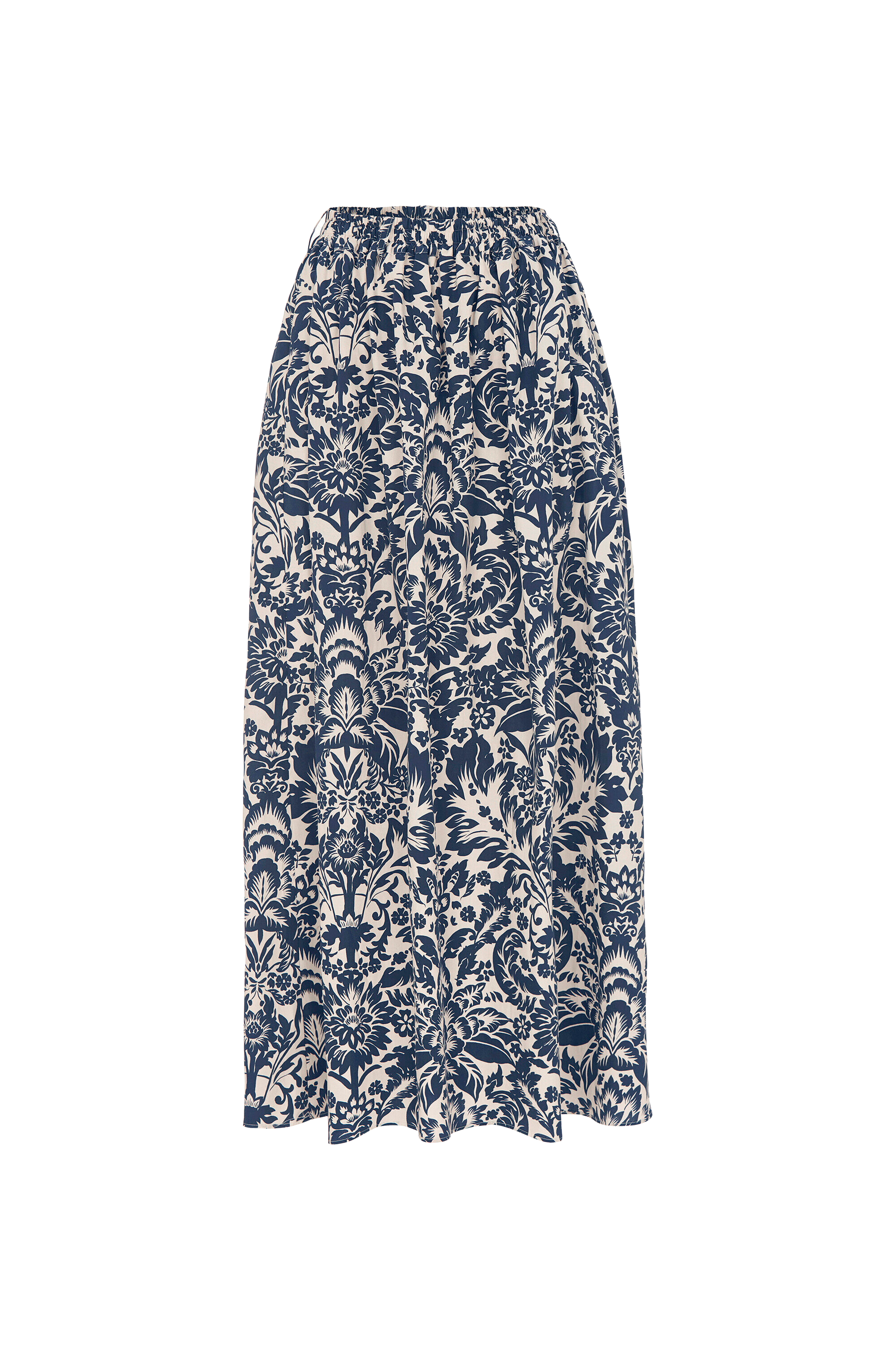Maxi-nederdel med elastik i taljen og lommer i sidesømmene, fremstillet af bci-bomuld. Det marineblå mønster på khakifarvet baggrund er inspireret af traditionelt bloktryk.