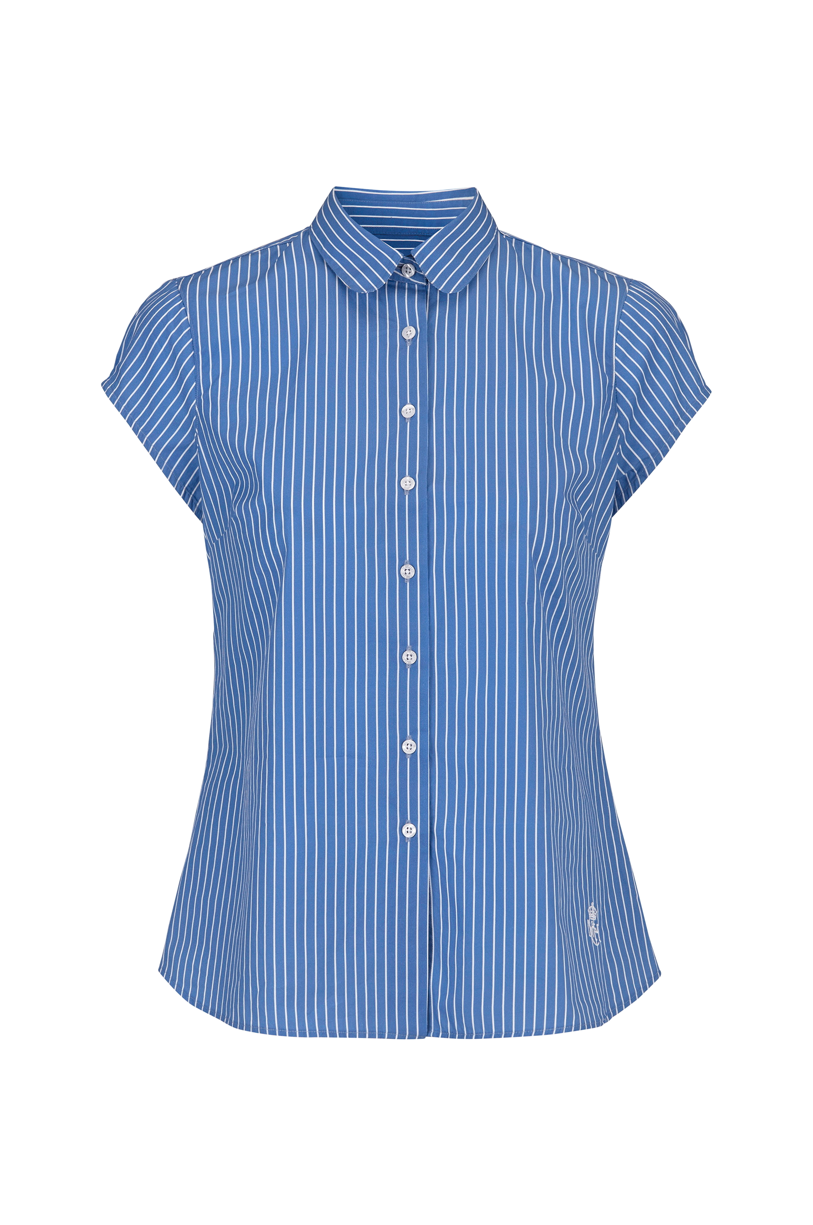 En formet, kortærmet skjorte med peter pan-krave. En feminin skjorte med en vævet blå og hvid stribe.