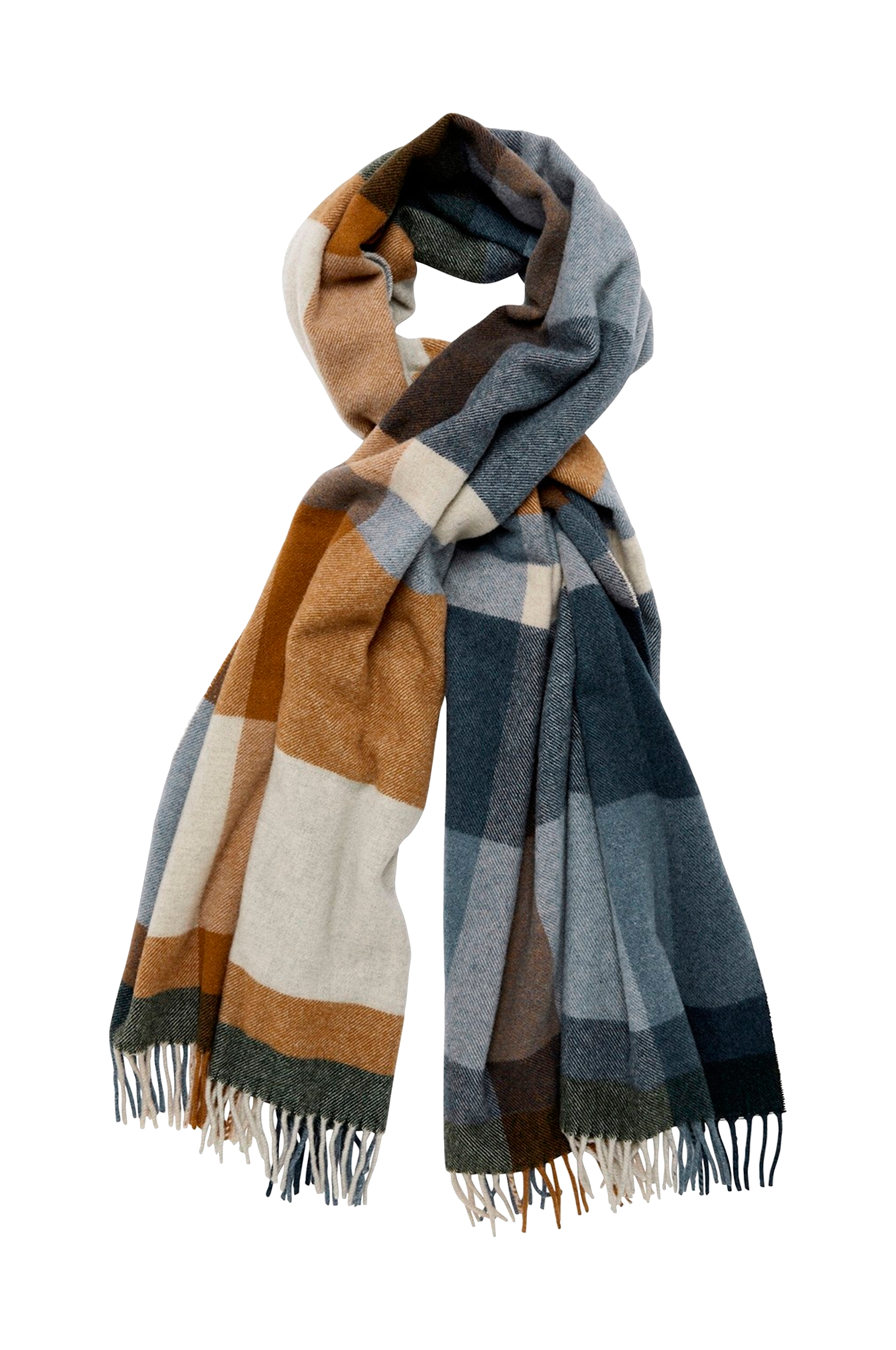 Et dejligt, stort uldtørklæde med en flot brun, hvid og blå tern.