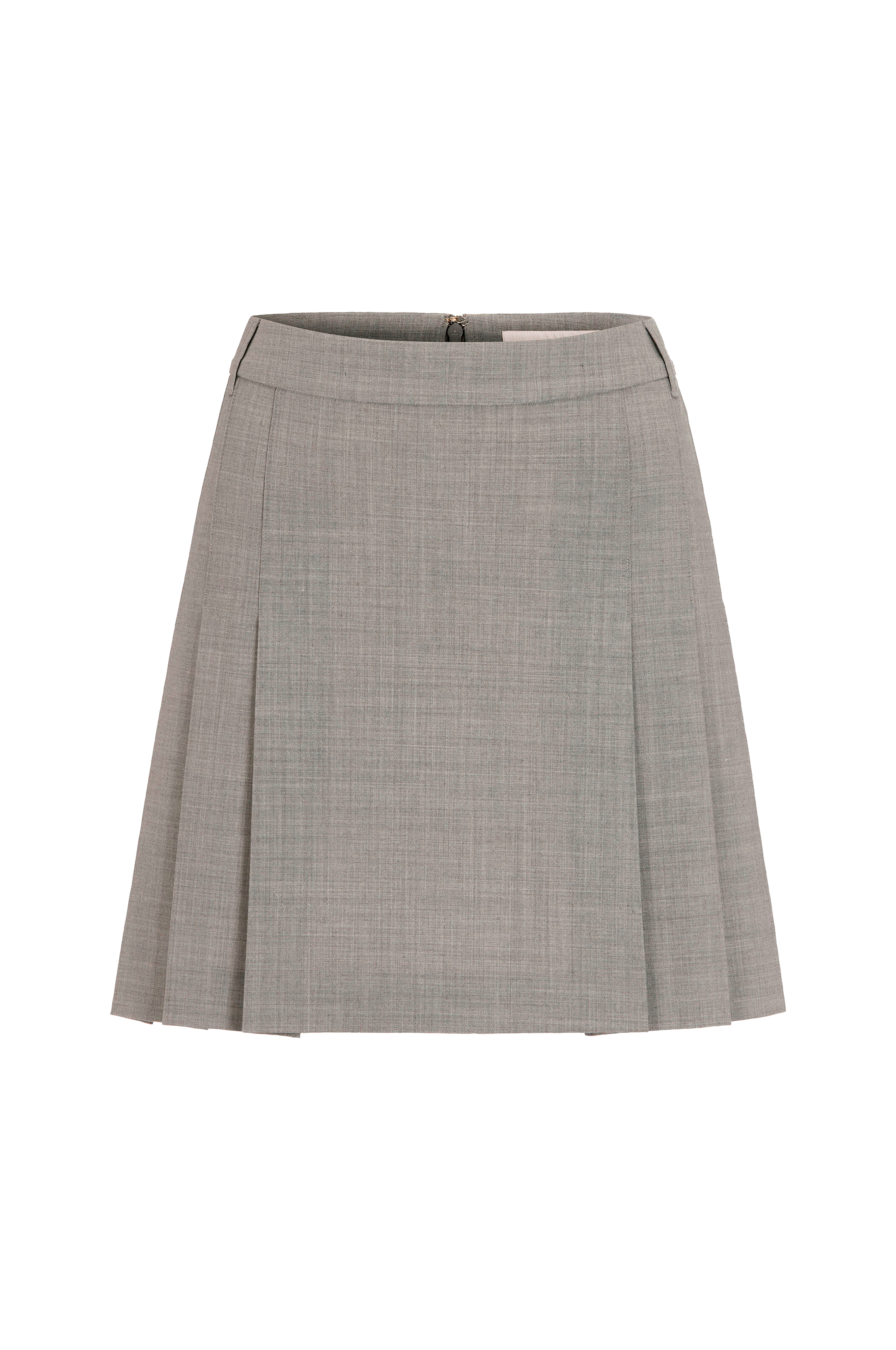 Kort nederdel med plissering og lynlås bagpå i midten. Nederdelen er lavet af en uldblanding med stretch for en stilfuld pasform. Den er 45 cm lang bagpå i midten.