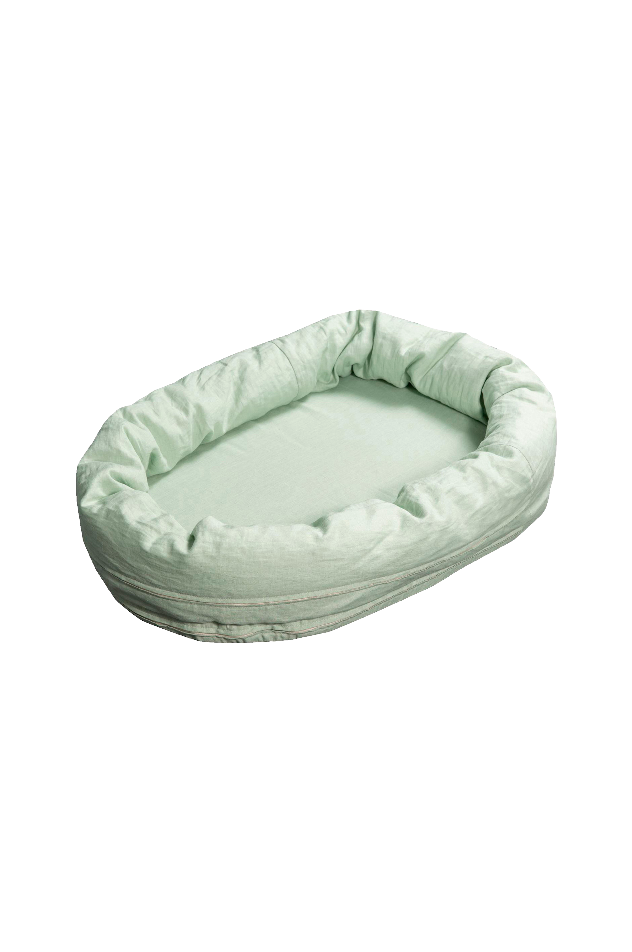 Grøn, skøn babynest i naturmateriale af 100% stonewashed hør. Denne høje, stabile babynest med bløde, formbare kanter fungerer fint som hyggelig indsats i tremmesengen.