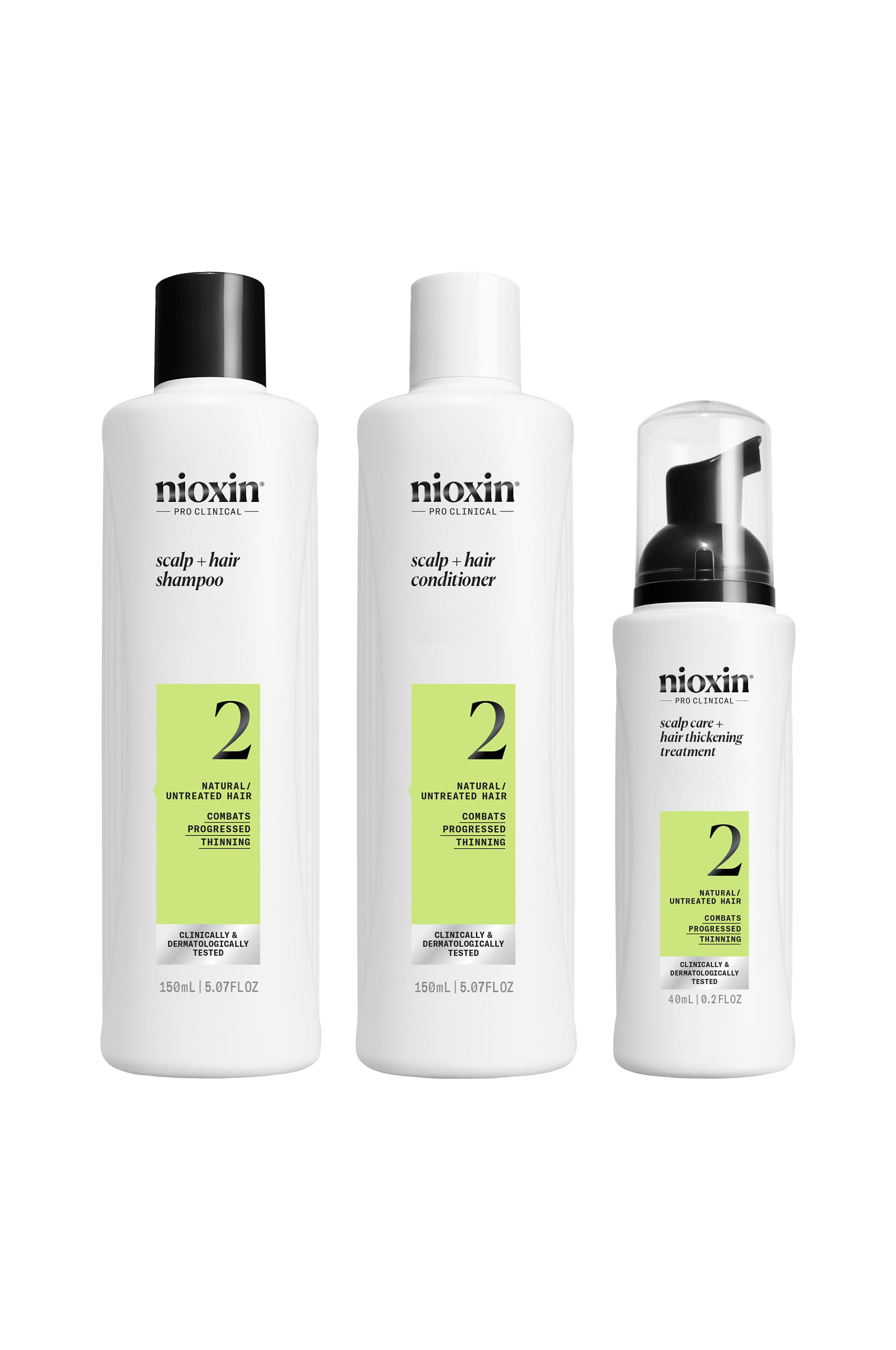 Nioxin System 2 Trial Kit er en hårpleje system til naturligt hår med fremskreden udtynding. Dette unikke sæt af tre professionelle hårprodukter, der er baseret på en avanceret hudplejetilgang, er specielt formuleret som en hårfortykkende behandling, der giver fyldigere hår. Nioxin System 2-kuren reducerer hårfald på grund af brud, styrker håret og giver en sund glans til naturligt hår, samtidig med at hovedbunden opfriskes. Nioxin Cleanser Shampoo fjerner snavs, overskydende olie og andre miljømæssige rester fra hovedbunden og håret. Nioxin Scalp Therapy Conditioner er en letvægtsbalsam, der hjælper med at give håret modstandskraft, samtidig med at den fugter hovedbunden og håret fra rod til spids. Nioxin Scalp & Hair Treatment opfrisker hovedbunden og hjælper med at give tykkere hår ved at øge fylden i hvert hårstrå. Det er klinisk bevist, at kit reducerer hårfald på grund af brud med op til 91 %**.
