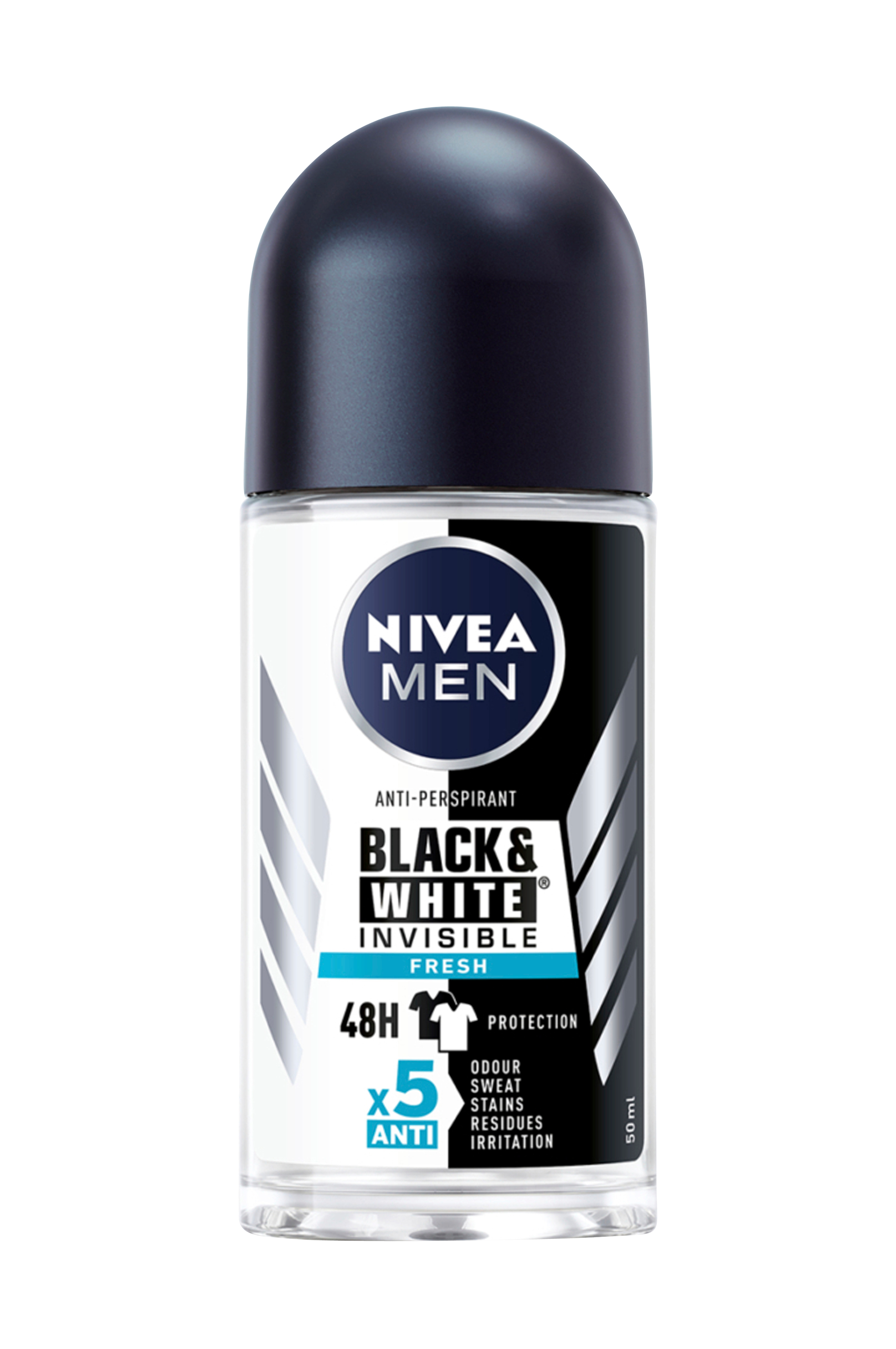 NIVEA MEN Black & White Invisible Fresh antiperspirant deodorant forhindrer hvide mærker på mørkt tøj og gule pletter på lyst tøj. Den unikke formel giver dig en frisk følelse og beskytter dig i 48 timer mod sved og kropslugt men er samtidigt skånsom mod din hud. Desuden beskytter antiperspiranten dig mod lugt, sved, pletter, rester og irritationer. Dermatologisk testet.