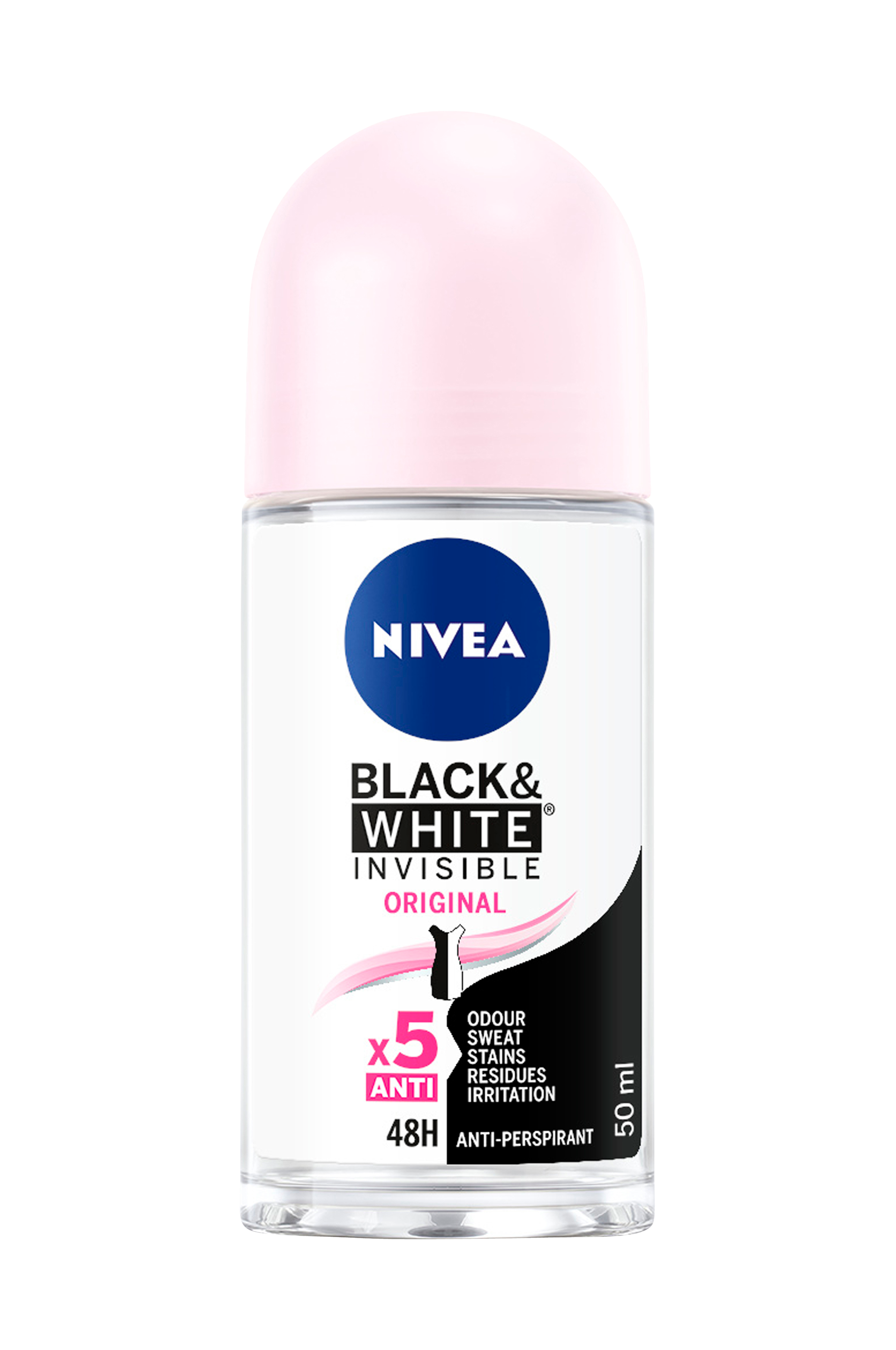 Nivea Black & White Original Roll On beskytter dit tøj og din hud. Produktet beskytter mod hvide mærker på dit sorte tøj og gule pletter på dit hvide tøj. Desuden beskyttes du mod svedlugt, sved, pletter, rester og irritationer. Antiperspiranten tilbyder pålidelig beskyttelse i 48 timer og passer på din hud. Den indeholder ikke ethylalkohol. Dermatologisk testet. Produktets roll on-format er perfekt til en hurtig opfriskning, når du er på farten.