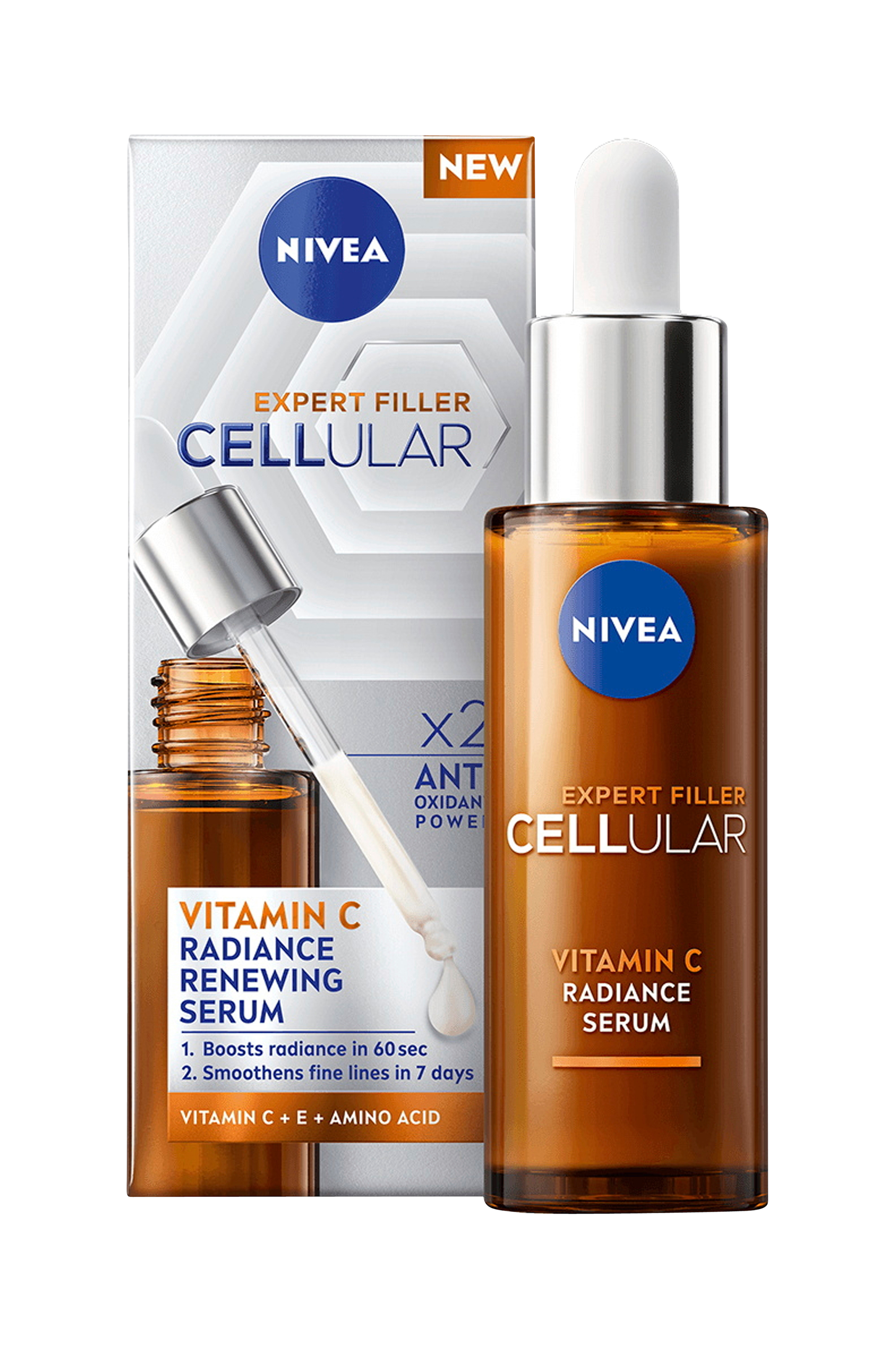 Nivea Cellular Expert Filler Vitamin C Radiance Serum er et avanceret serum til forbedret udstråling, der varer ved. Med sin lette og ikke-fedtende formel giver dette ansigtsserum en øjeblikkelig frisk og glat hudfornemmelse. Den indeholder C- og E-vitamin, som giver 2x antioxidant effekt, beskytter mod frie radikaler og eksterne stressfaktorer (f.eks. forurening og solskader) og hjælper med at korrigere og forebygge tidlige tegn på aldring. Den tredje aktive ingrediens er en aminosyre, som er en naturlig fugtgiver, der altid efterlader huden velhydreret og blød. Dette produkt udglatter fine linjer på 7 dage (selvvurdering, 32 kvinder, 2021).
