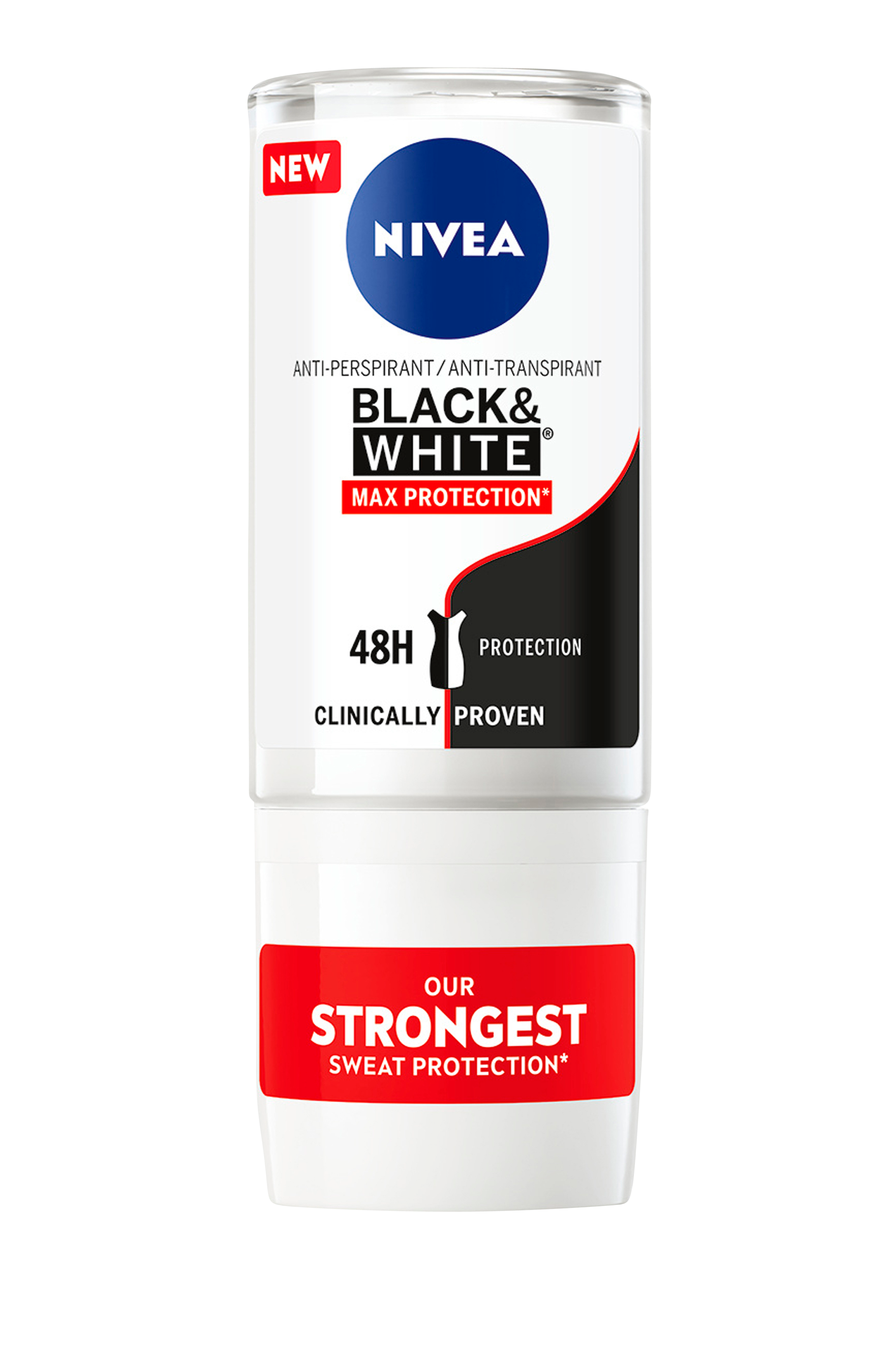 Nivea Black & White® Max Protection Roll On giver den stærkeste svedbeskyttelse blandt Niveas Black & White® antiperspiranter (klinisk bevist). Pålidelig beskyttelse mod sved, som passer på din hud. Deodoranten beskytter også mod hvide pletter på sort tøj og mod gule pletter på hvidt tøj. Sort tøj bliver ved med at være sort og hvidt tøj hvidt længere. Den beskytter dig desuden i 48 timer mod sved og kropslugt og er samtidig plejende mod din hud. Indeholder ikke etylalkohol. Dermatologisk testet og passer til alle hudtyper.