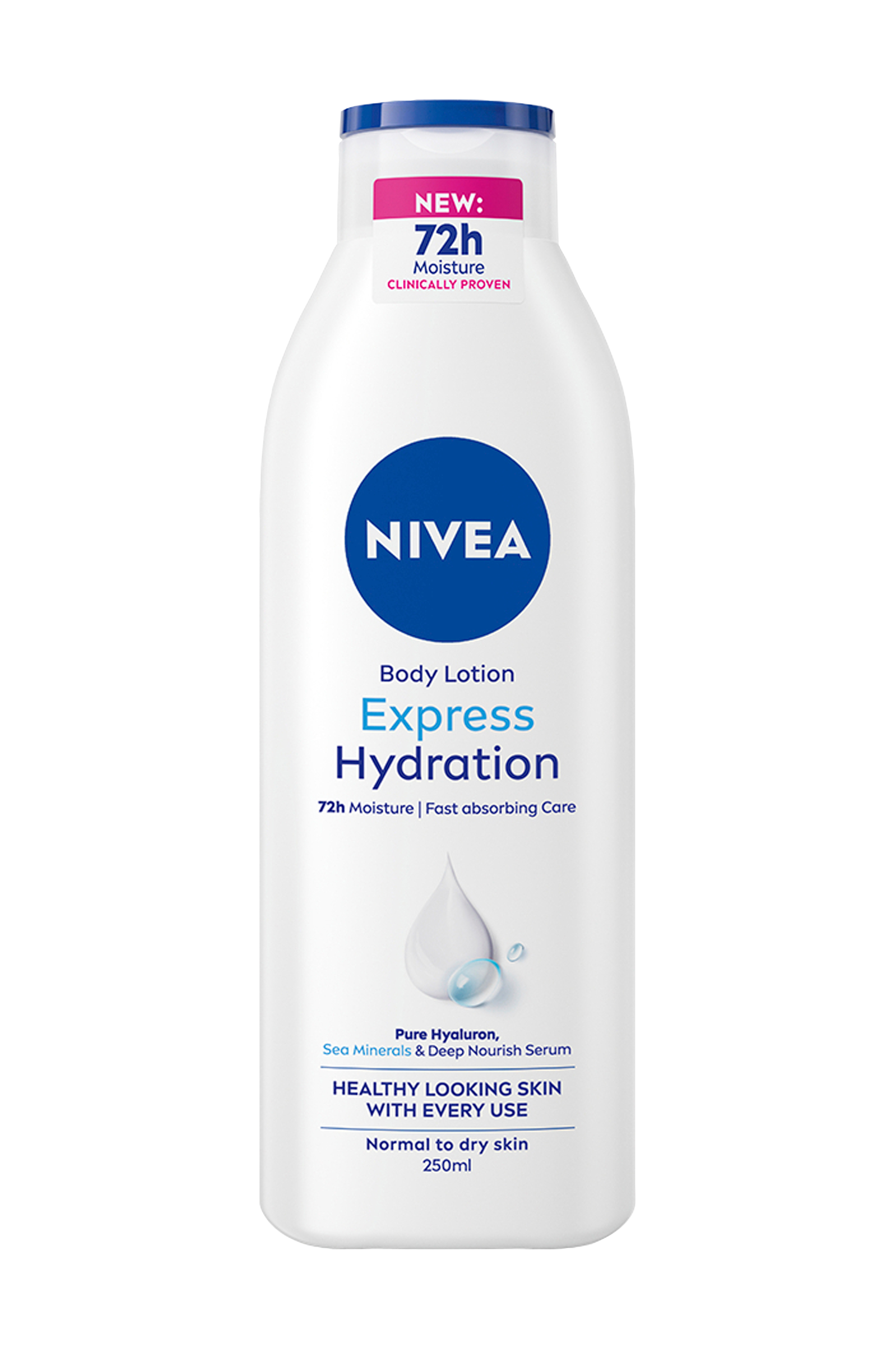 Plej din tørre hud med Nivea Express Hydration Body Lotion med den nye og forbedrede formel, der giver klinisk dokumenteret hydrering i 72 timer. Efterlader huden med et sundt udseende efter hver brug. Ultra-let formel beriget med hyaluronsyre, havmineraler og dybt nærende serum. Denne bodylotion har en hurtigt absorberende, ikke-klæbende og nærende formel, der er velegnet til normal til tør hud. Nogle hudområder tørrer hurtigere ud end andre, så det er vigtigt at give din hud ekstra næring hele året rundt.