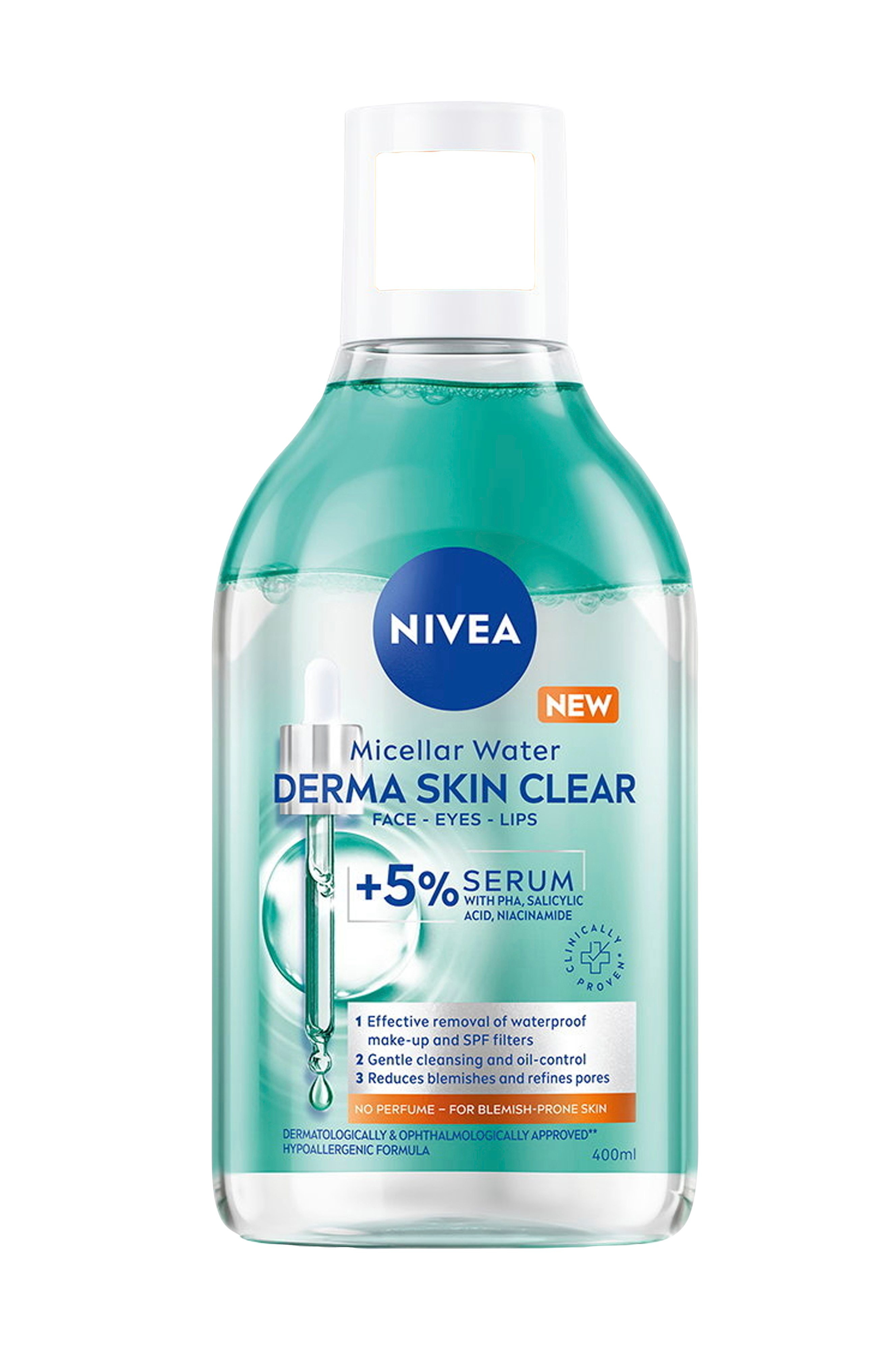 Nivea Derma Skin Clear Micellar Water til akneudsat hud er beriget med 5 % serum, der indeholder Pha, salicylsyre og niacinamid. Det fjerner effektivt vandfast makeup, snavs og Spf med blot et par strøg og efterlader huden ren og frisk. Produktet reducerer urenheder, forfiner porerne og kontrollerer olieproduktionen for en glat og klar hud. Det er ikke nødvendigt at gnide, hvilket gør det skånsomt for huden uden at forårsage irritation. Effekten mod urenheder er testet i kliniske studier, hvilket giver tryghed. Formlen er parfumefri og er dermatologisk og oftalmologisk testet for hud- og øjenkompatibilitet, hvilket gør den sikker til daglig brug.