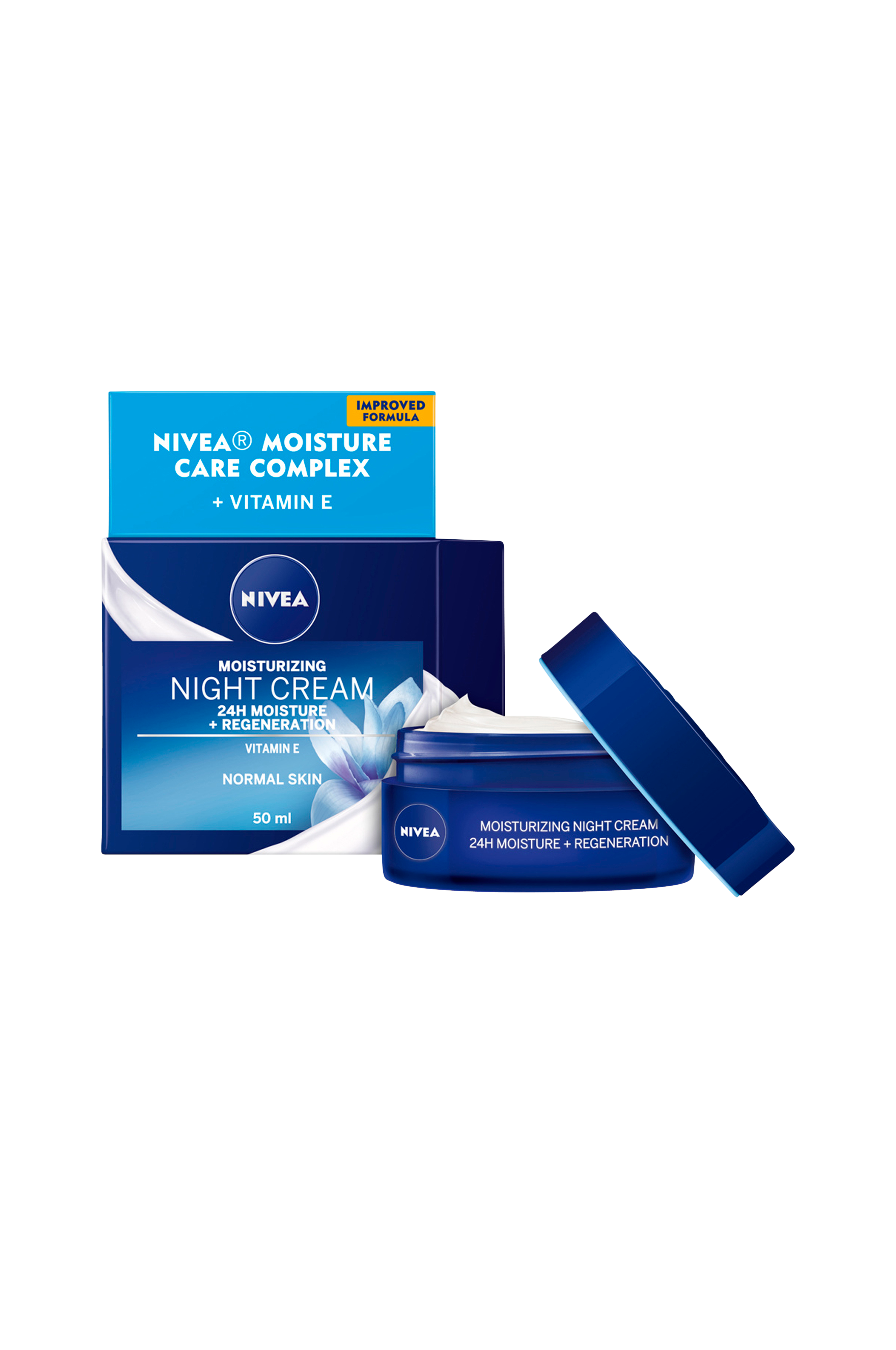 Nivea Moisturizing Night Cream fugter intensivt din hud i 24 timer og balancerer hudens eget fugtniveau. Formlen med NIVEA Moisture Care Complex, E-vitamin og Provitamin B5 er fugtgivende og absorberes hurtigt af huden. Cremen indeholder også lotusekstrakt og antioxidanter som beskytter huden mod oxidativ stress og opbygning af frie radikaler. Dermatologisk testet.