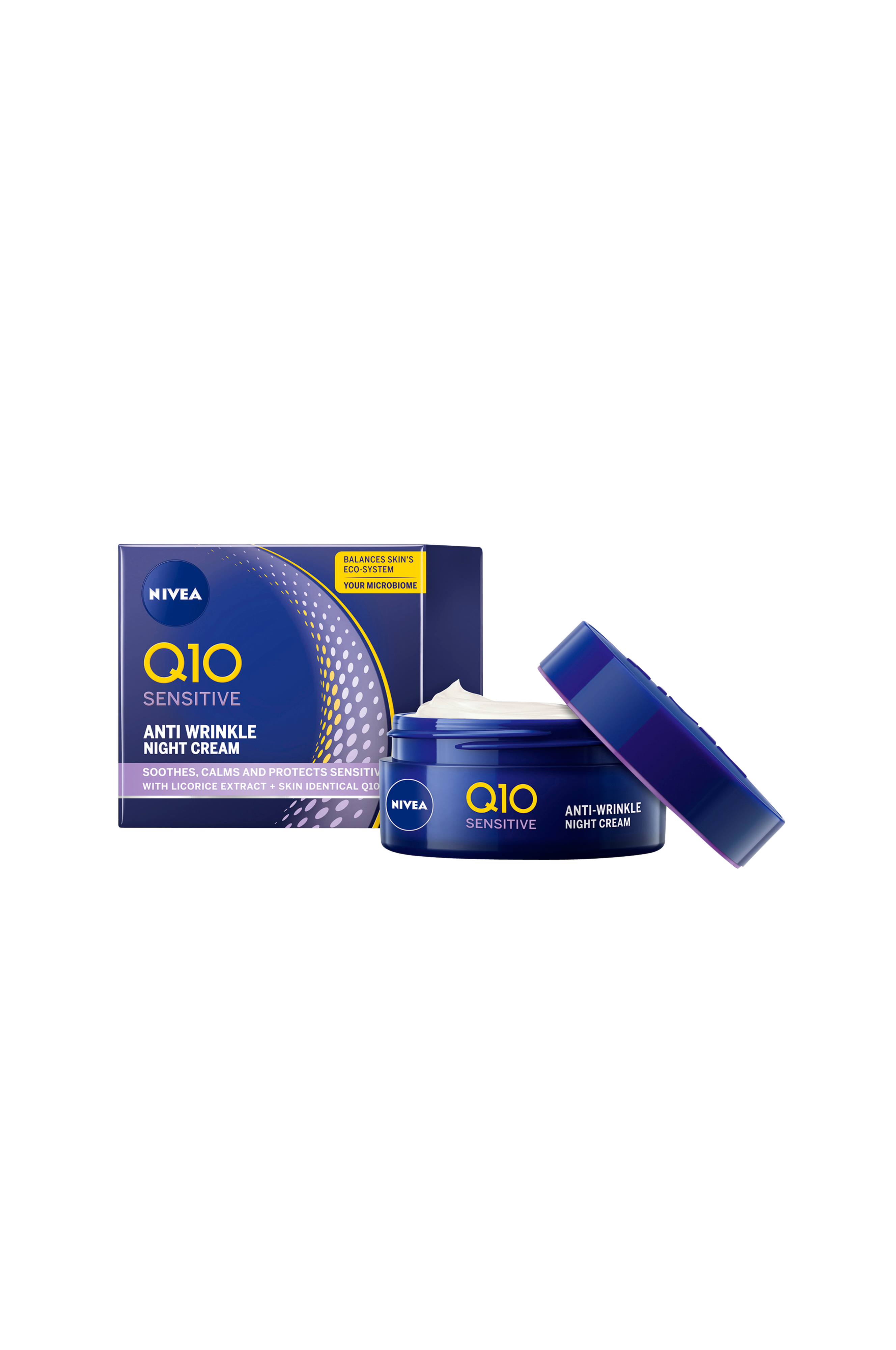 NIVEA Q10 Sensitive Parfume Free Night Cream virker i harmoni med hudens mikrobiom, hudens eget forsvar. Hudens mikrobiom er som et "usynligt lag" af naturlige bakterier på hudens overflade. Formlen indeholder hudidentisk Dual Action Coenzyme Q10. NIVEAs reneste kvalitet af Q10 beskytter hudcellerne mod ydre angreb og giver hudcellerne energi, som hjælper med regenerering*. Vores parfumefri natcreme arbejder for synligt at reducere rynker. Formlen bekæmper tørhed, stramhed og rødme for en roligere, blødere og sundere hud. Dermatologisk godkendt.