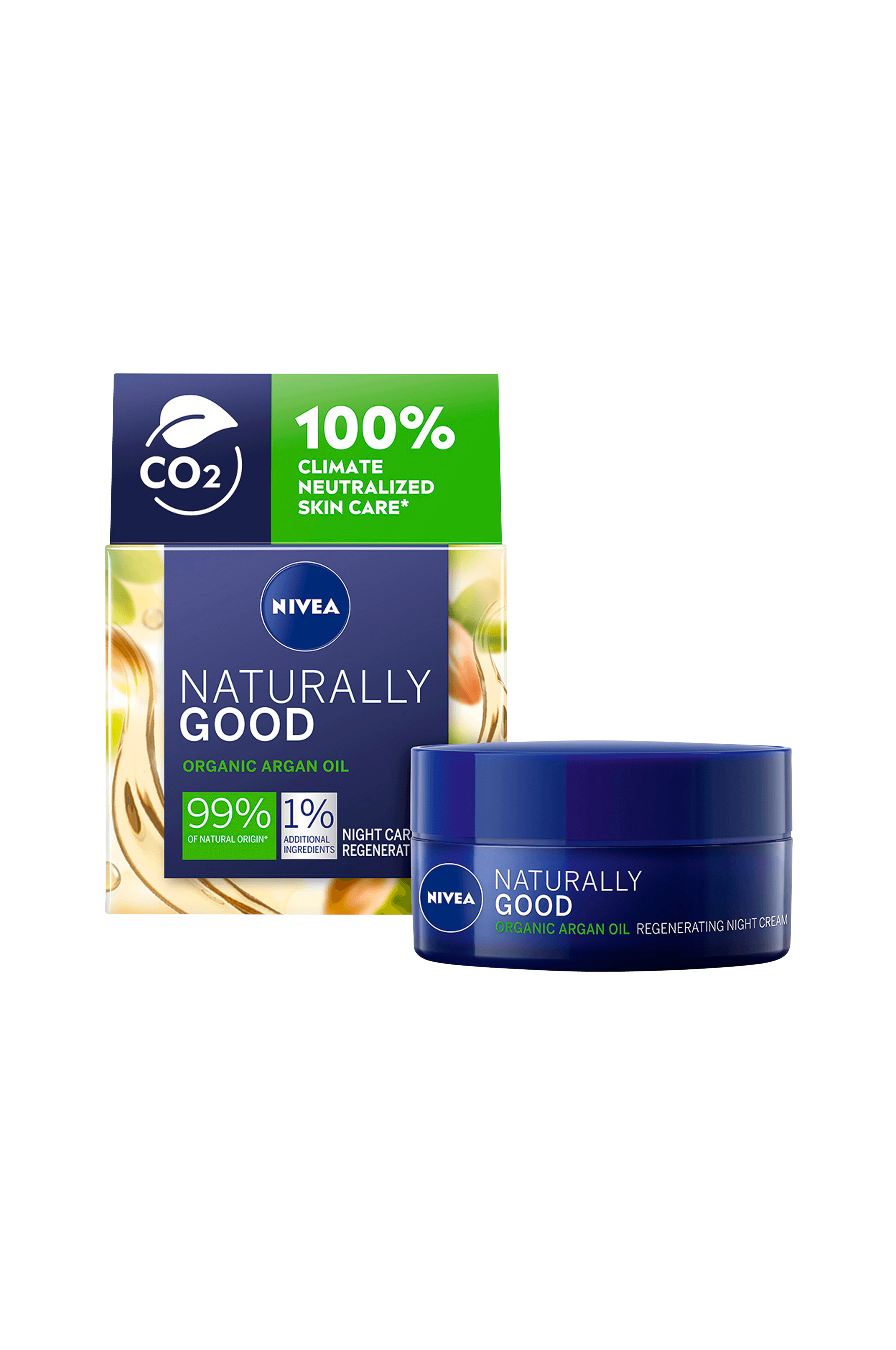 Nivea Naturally Good Regenerating Night Cream indeholder 99% naturlige* ingredienser. Vi anvender ingredienser inspireret af naturen for at skabe højtydende produkter som fremhæver din huds naturlige skønhed. Natcremen fugter og regenererer huden i løbet af natten, når huden er mest modtagelig, og du vågner op med blød og fugtet hud. Indeholder økologisk arganolie som plejer huden intensivt. Dermatologisk testet. Uden animalske ingredienser