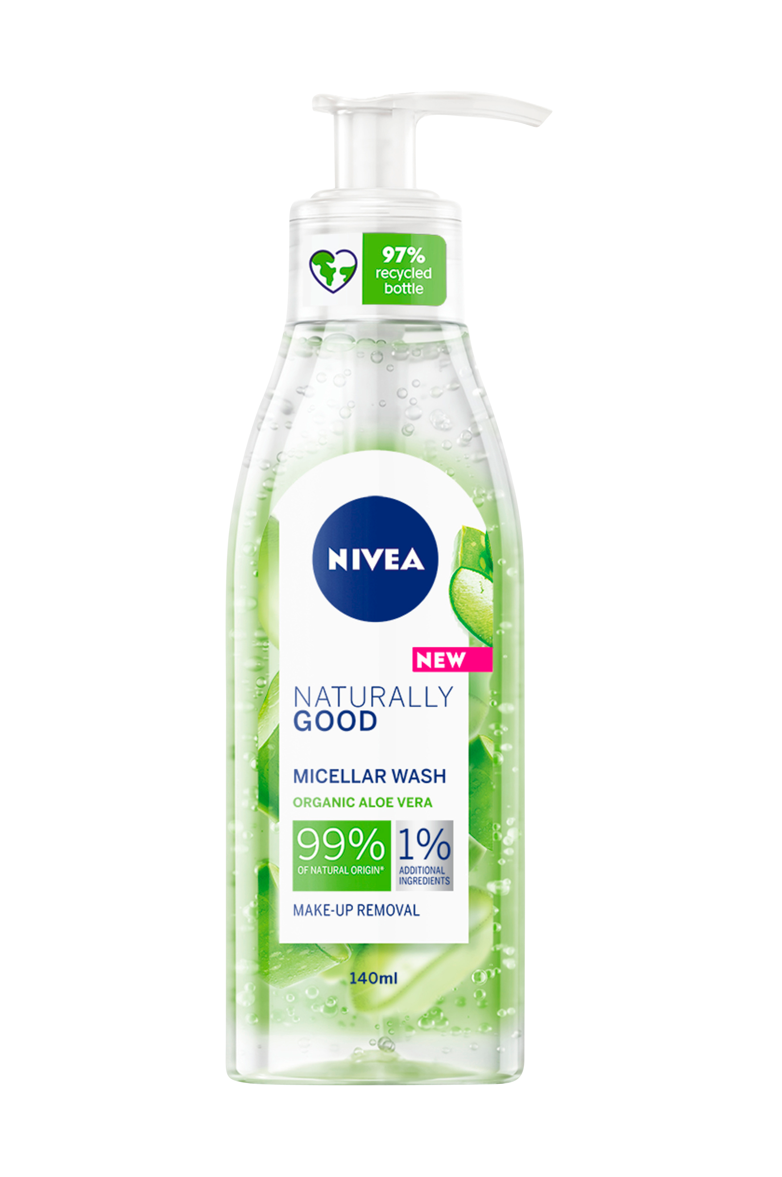 Nivea Naturally Good Micellar Wash med ekologisk aloe vera innehåller 99% naturliga ingredienser och övriga 1% säkerställer maximal trygghet för din hud. Den uppfriskande formulan med fräsh doft rengör huden effektivt och vårdande och tar bort makeup. Formulan fungerar likt en magnet som effektivt fångar upp envist smink, talg och smuts. Resultatet är en ren hud som kan andas. Dermatologiskt testad. Lämplig för normal till fet hy.