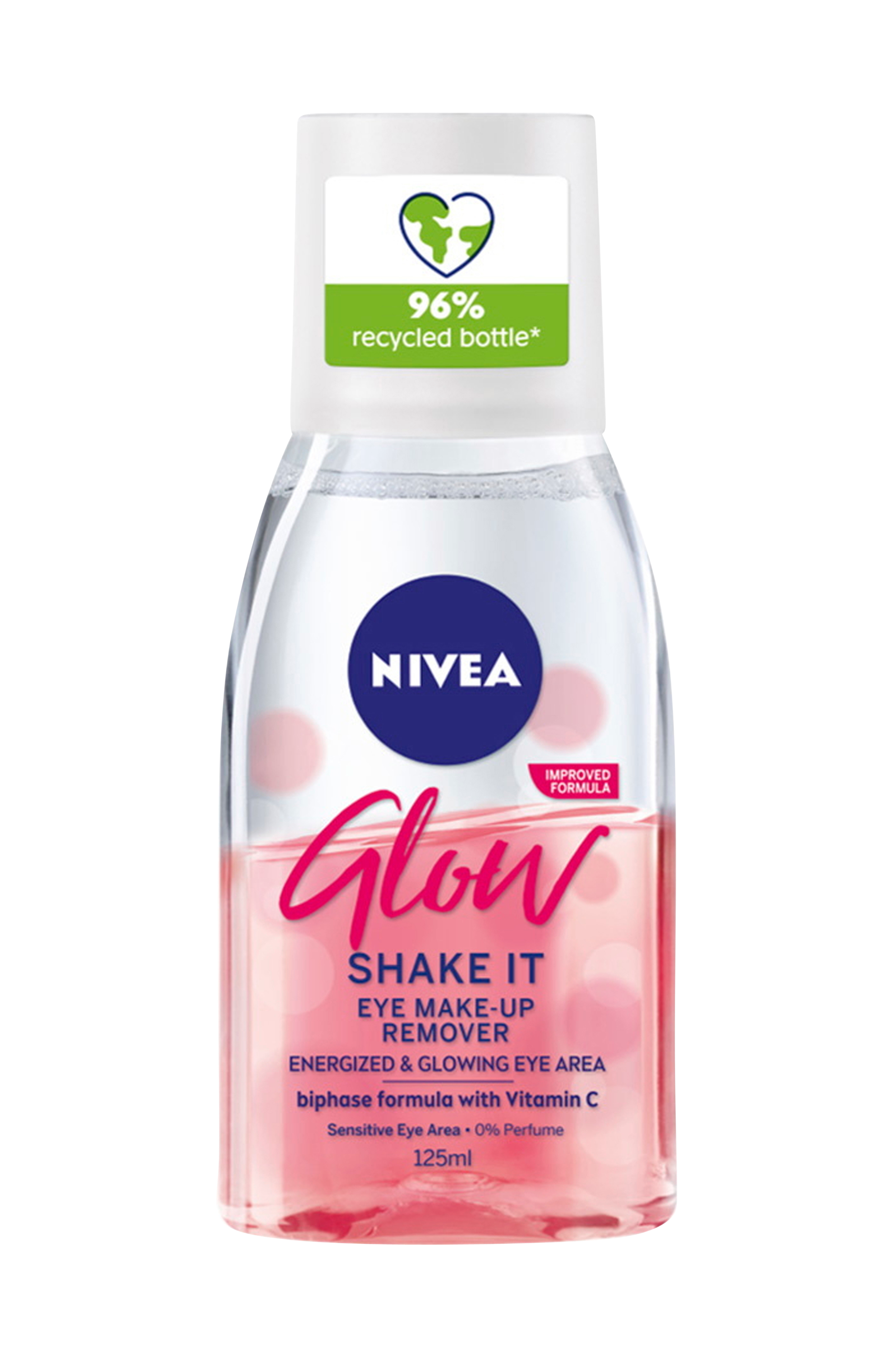 NIVEA Glow Eye Make-up Remover fjerner effektivt ekstremt vandfast make-up og mascara og er skånsom mod det følsomme område omkring øjnene, beriget med energigivende C-vitamin. Denne makeupfjerner kræver ingen gnidning: påfør produktet på en vatrondel og rengør forsigtigt øjenområdet, start indefra og stryg til ydersiden af dine øjne. Passer til alle hudtyper. Produktet er også velegnet til kontaktlinsebrugere: dermatologisk og oftalmologisk godkendt.