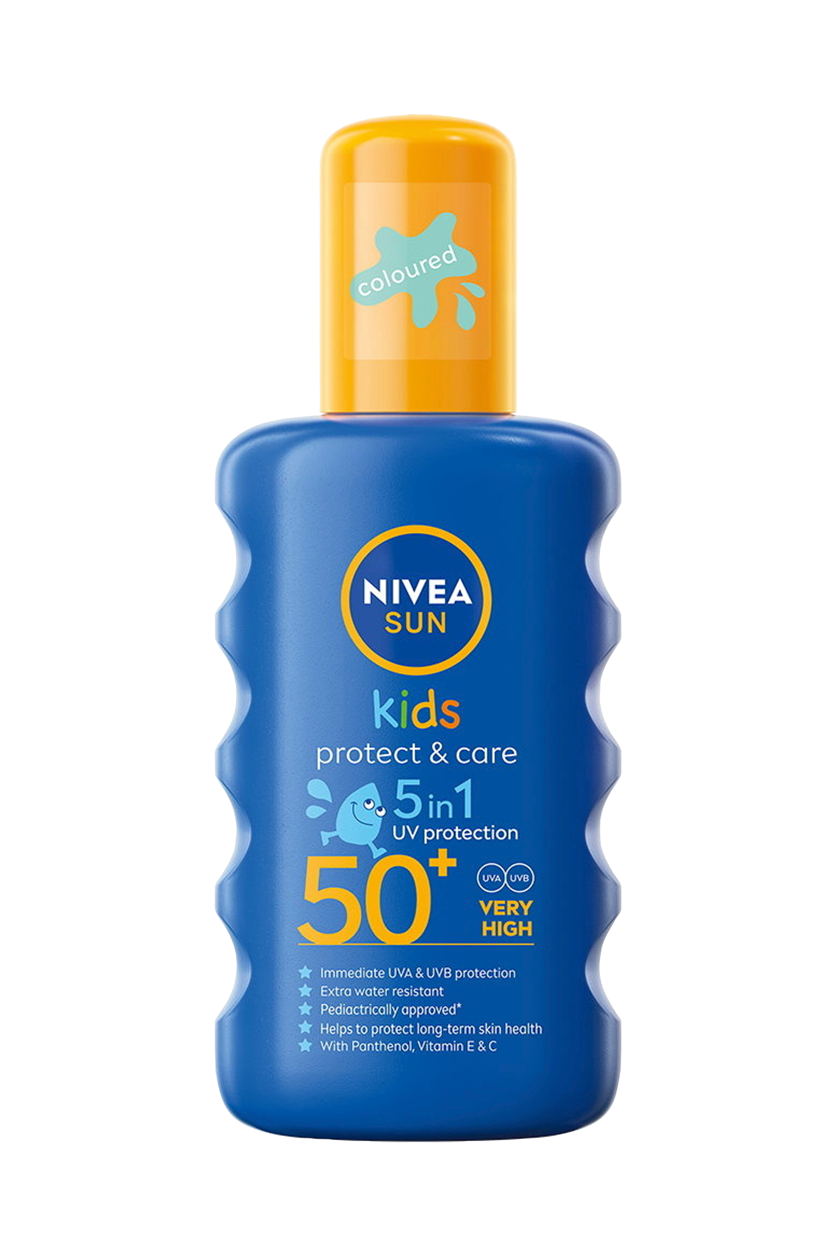 Nivea Sun Protect & Care Kids Spray Spf 50+ er en solspray til børn med meget høj solbeskyttelse. Den giver øjeblikkelig beskyttelse mod Uva og Uvb stråler. Den er specielt udviklet til at beskytte børns følsomme hud og hjælper med at forebygge solskoldning og langvarige UV-skader. Produktet er ekstra vandafvisende, hvilket gør det til et produkt, der er ideelt til aktive børn, der leger udendørs. Den forbedrede formel indeholder ingredienser som panthenol, E- og C-vitamin, der er skræddersyet til at opfylde børns hudbehov. Formlen absorberes hurtigt, understøtter hudens beskyttende barriere og giver langvarig hydrering. Dermatologisk testet og godkendt af børnelæger.