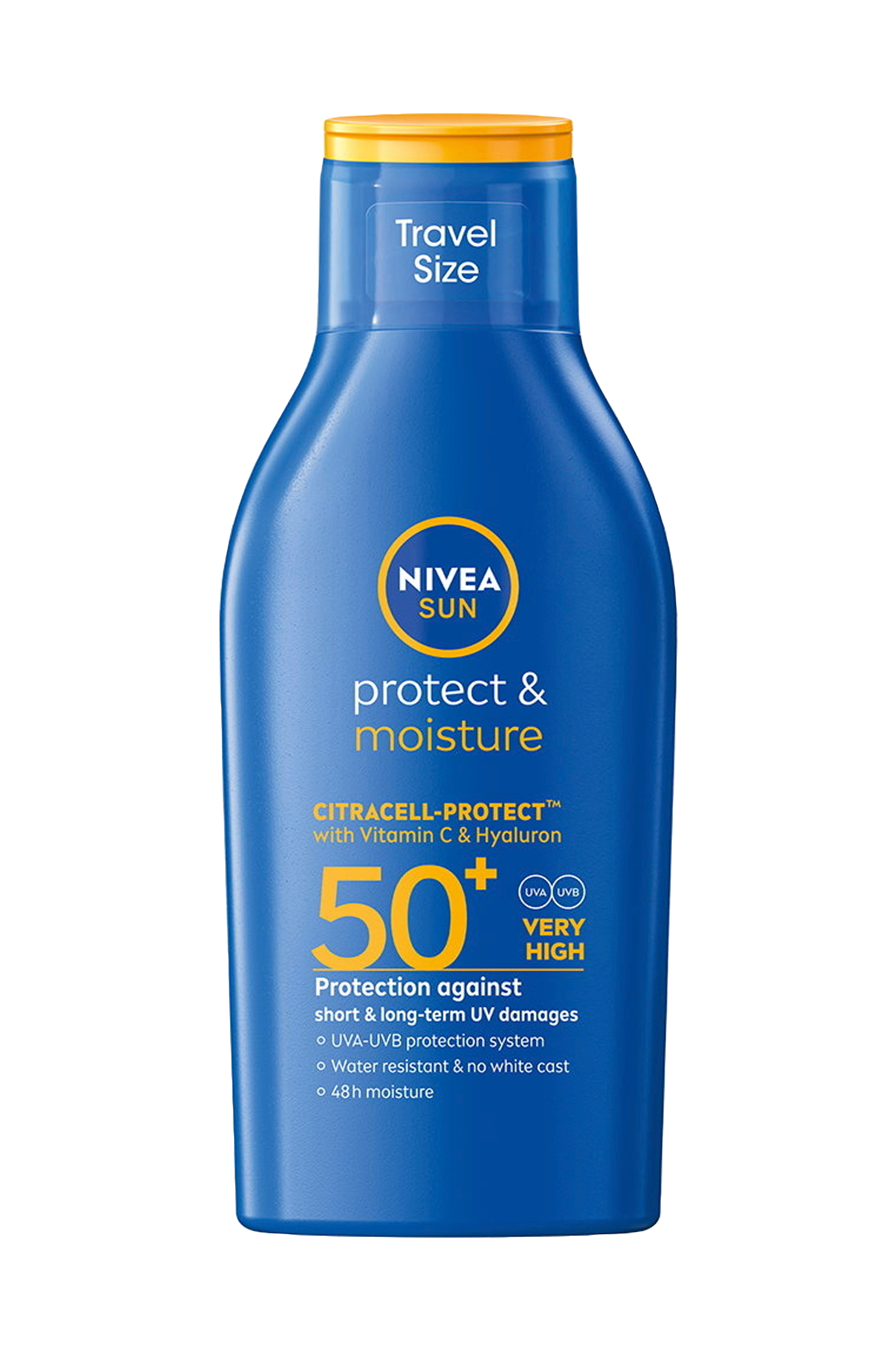 Nivea Sun Protect & Moisture Sun Lotion Spf 50+ er en solcreme med meget høj solbeskyttelse, der giver øjeblikkelig beskyttelse mod Uva og Uvb stråler samt for tidlig ældning af huden. Den nye formel med CitraCell-Protect, beriget med C-vitamin og hyaluronsyre, virker ud over UV-filtre ved at hjælpe huden med at danne en anden forsvarslinje og reducere oxidativ stress på celleniveau. Velegnet til alle hudtyper og dermatologisk testet. Ocean Respect-formlen respekterer havet ved at være fri for UV-filtre som Octinoxate, Oxybenzone og Octocrylene. Flasken er fremstillet af 96 % genbrugsmaterialer (undtagen hætte og etiket).