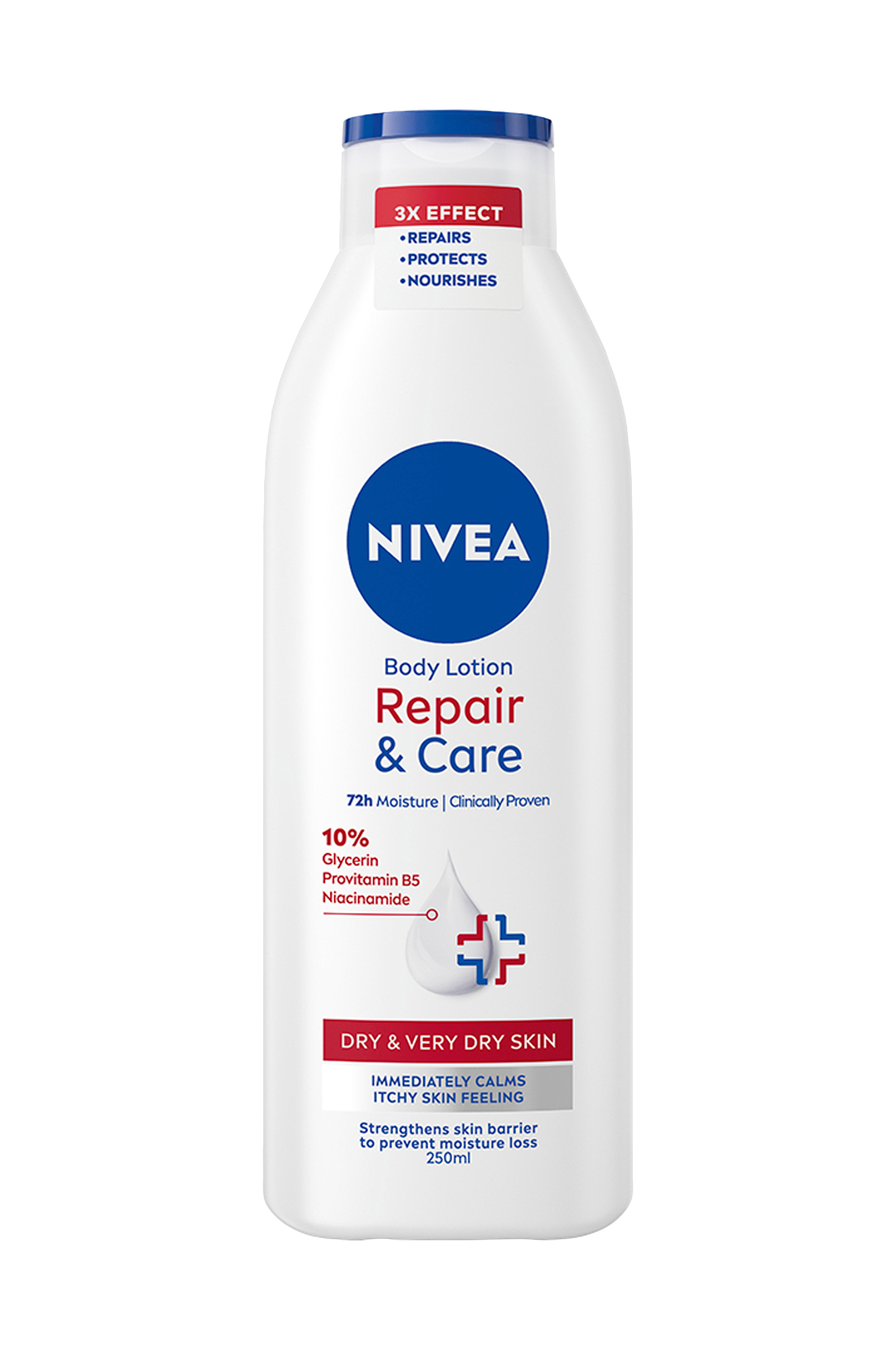 Nivea Repair & Care Body Lotion er en bodylotion, der styrker din hudbarriere. Med sin 3x effekt - reparation, beskyttelse og pleje - giver denne hudcreme den pleje, din hud har brug for. Lotionen indeholder et 10 % kompleks af glycerin, provitamin B5 og niacinamid, som øjeblikkeligt lindrer kløende hud og giver et sundt udseende. Ikke-klæbende og hurtigt absorberende formel, der fugter huden i 72 timer. Den er dermatologisk testet og passer perfekt til tør til meget tør hud. For at opnå de bedste resultater anbefaler vi at anvende denne bodylotion dagligt på hele kroppen.