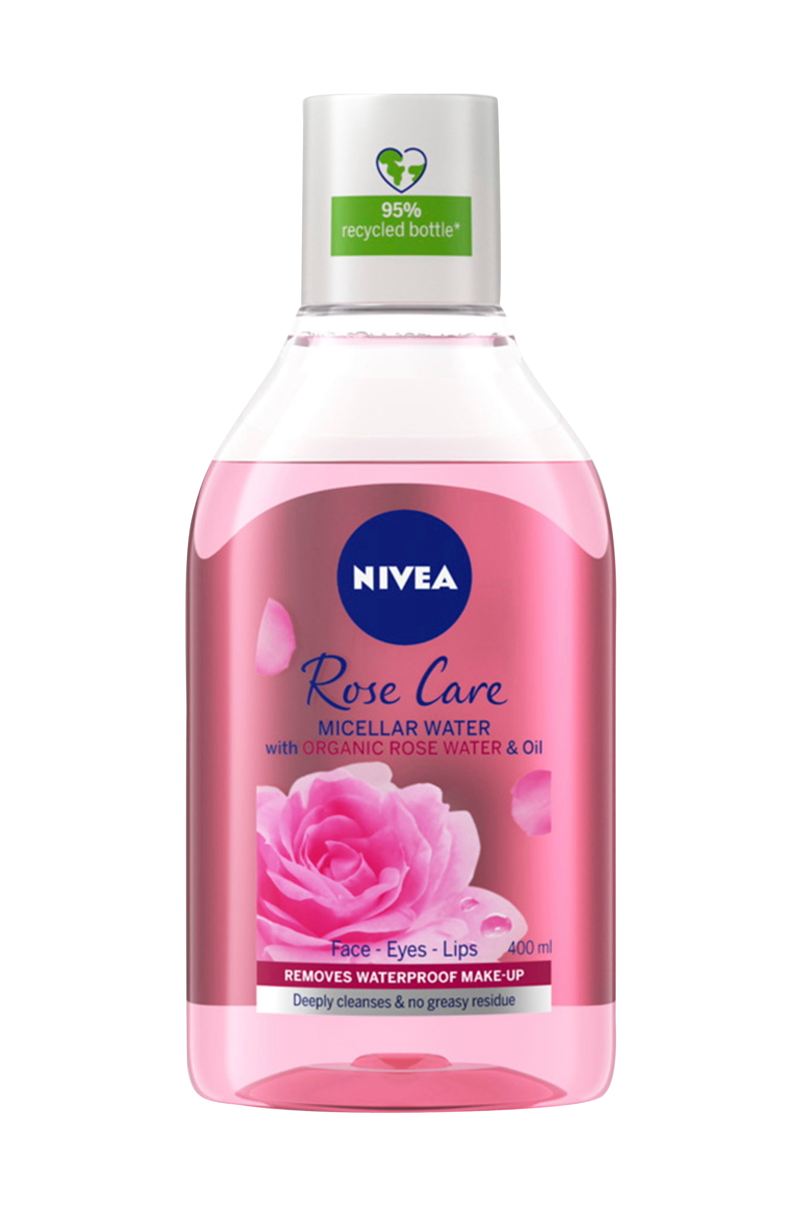 Nivea Rose Care Micellar Water med olie fjerner vandfast makeup og renser i dybden uden at du skal gnide eller skylle. Denne plejende micellærvand med rosenvand genopretter hudens naturlige fugtbalance og fugter hver gang du renser din hud. Passer til ansigtet, øjnene og læberne. Flasken er fremstillet af 95% genindvundet materiale (ekskl. låg og etiket). Dermatologisk testet.